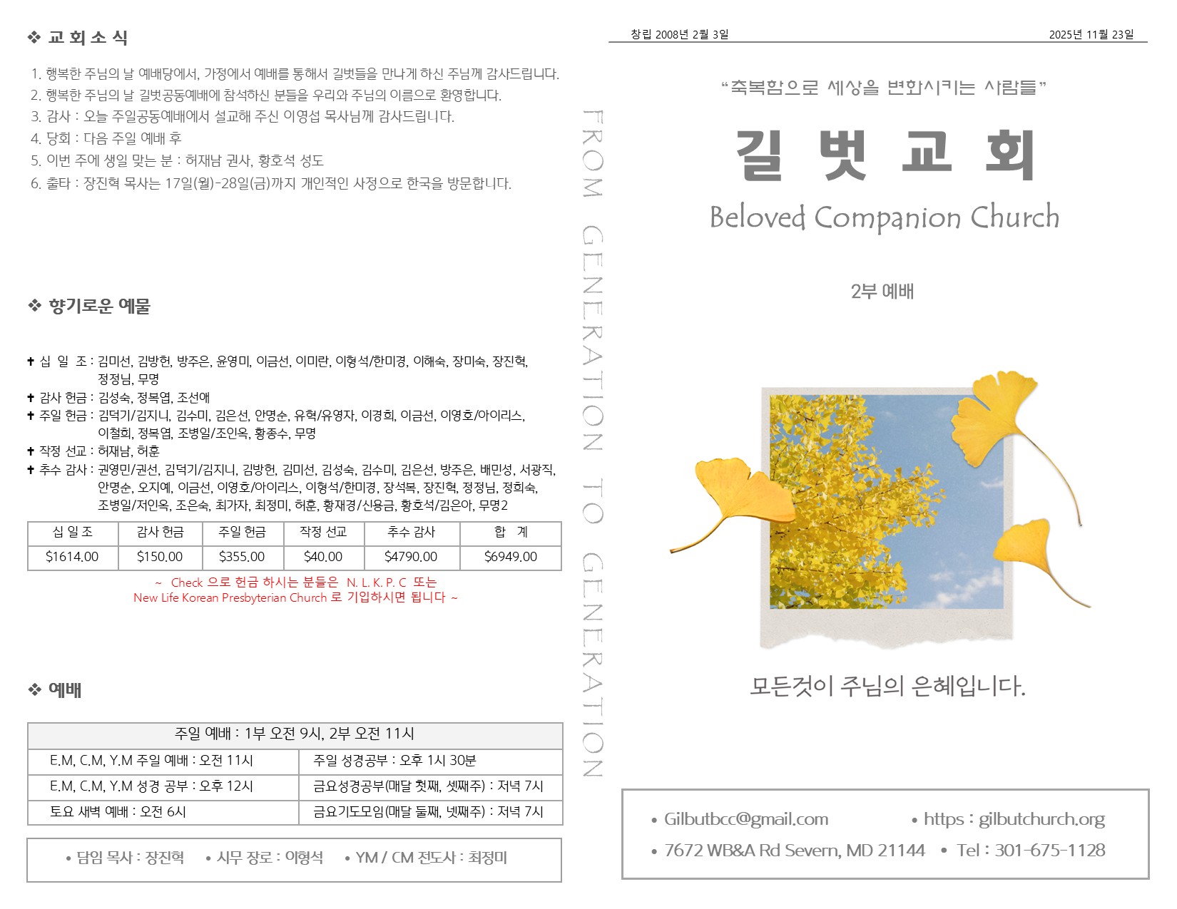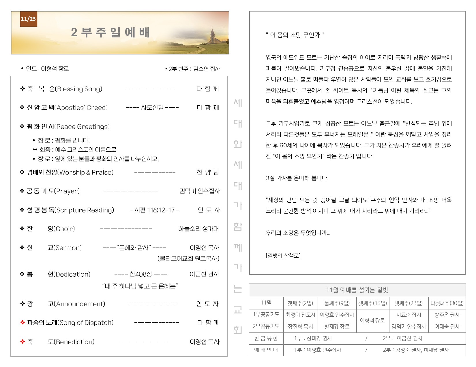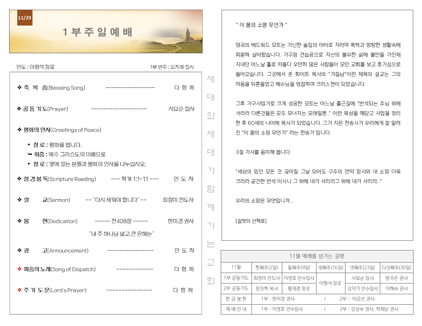11월 23일 주일 예배 주보 Publish on November 25,2025 | 길벗교회 페이지 정보 작성자 길벗교회 댓글 0건 조회 57회 작성일 25-11-25 13:18 목록 본문 11월 23일 주일 예배 주보 이전글11월 30일 주일 예배 주보 25.12.02 다음글11월 16일 추수감사주일 예배 주보 25.11.18 댓글 0 댓글목록 등록된 댓글이 없습니다. 목록