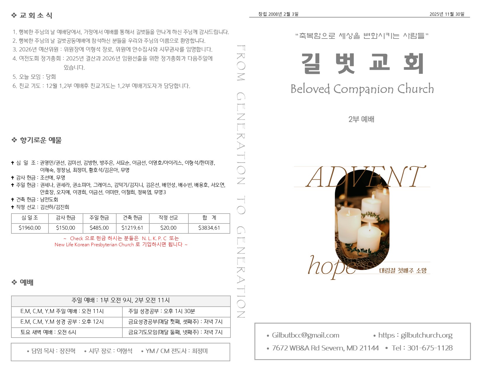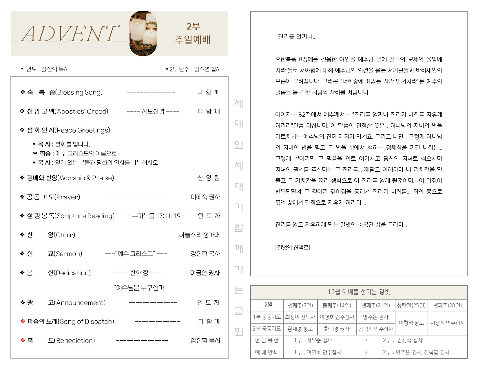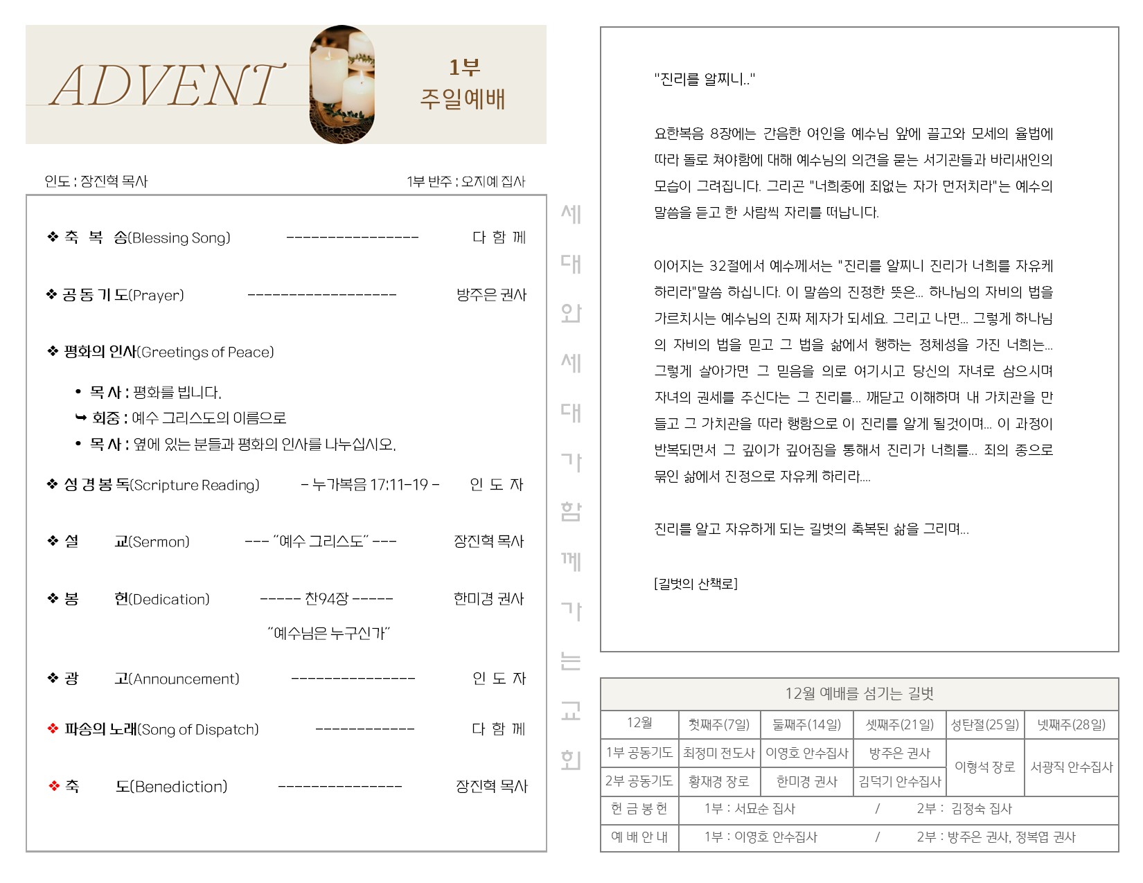 11월 30일 주일 예배 주보 Publish on December 02,2025 | 길벗교회 페이지 정보 작성자 길벗교회 댓글 0건 조회 12회 작성일 25-12-02 16:08 목록 본문 11월 30일 주일 예배 주보 다음글11월 23일 주일 예배 주보 25.11.25 댓글 0 댓글목록 등록된 댓글이 없습니다. 목록