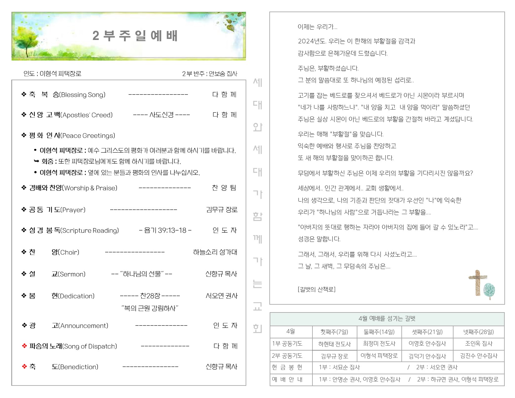4월 7일 주일예배 주보 Publish on April 08,2024 | 길벗교회 페이지 정보 작성자 길벗교회 댓글 0건 조회 1,315회 작성일 24-04-08 05:12 목록 본문 4월 7일 주일 예배 주보 이전글4월 14일 주일 예배 주보 24.04.18 다음글3월 31일 부활주일 예배 주보 24.04.02 댓글 0 댓글목록 등록된 댓글이 없습니다. 목록