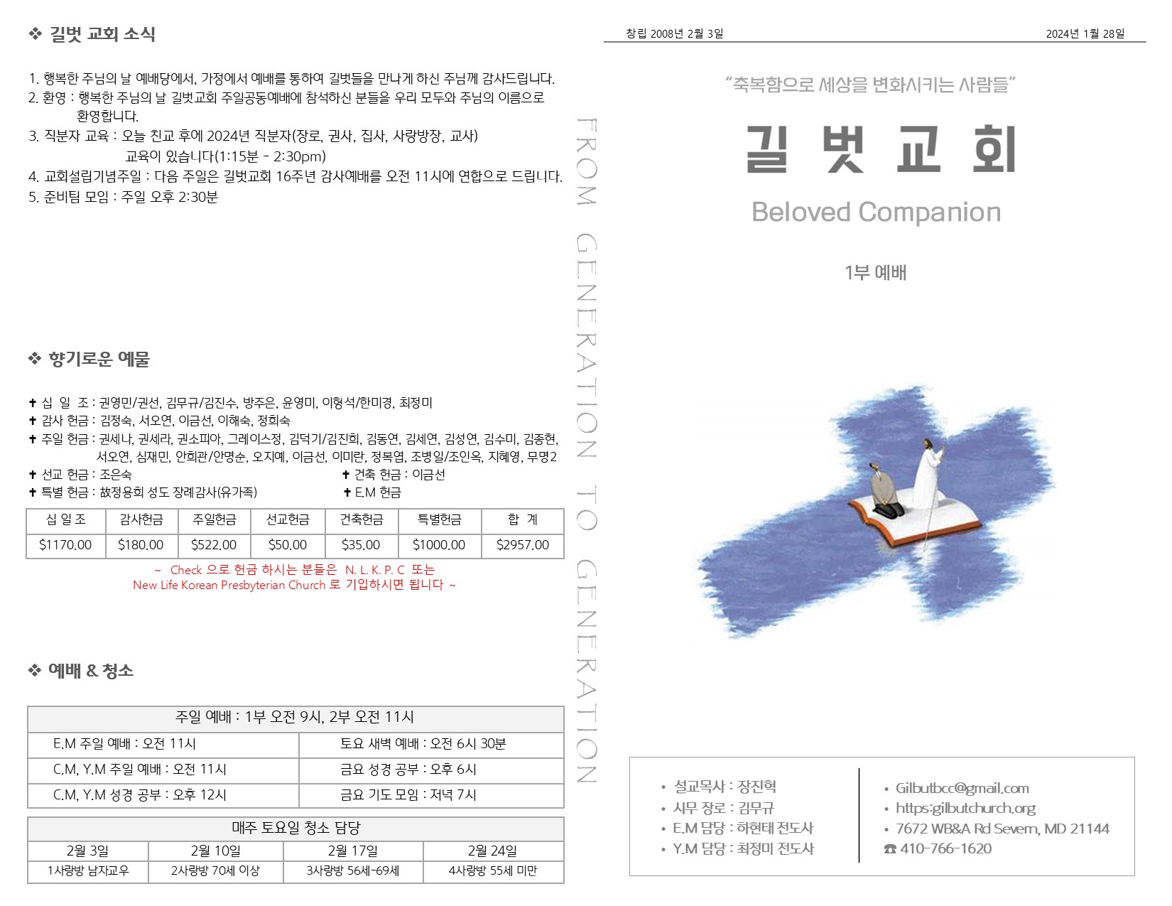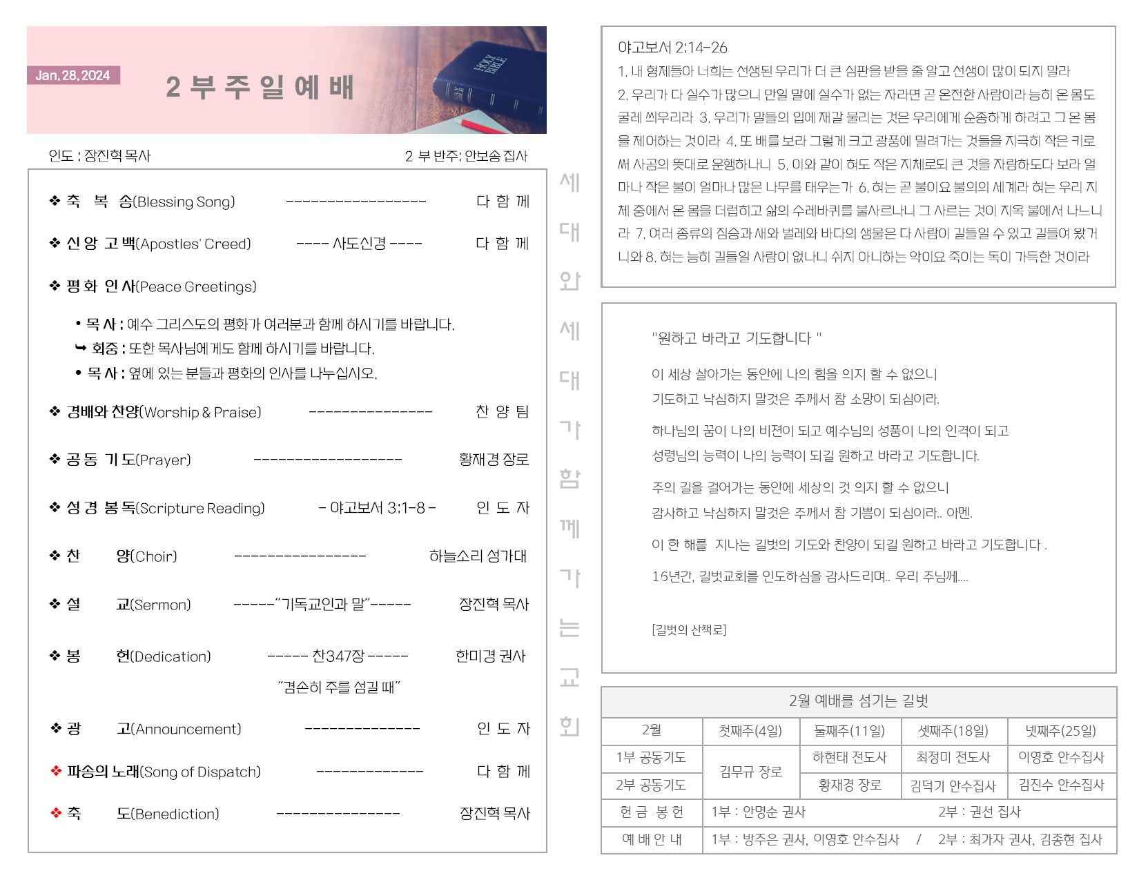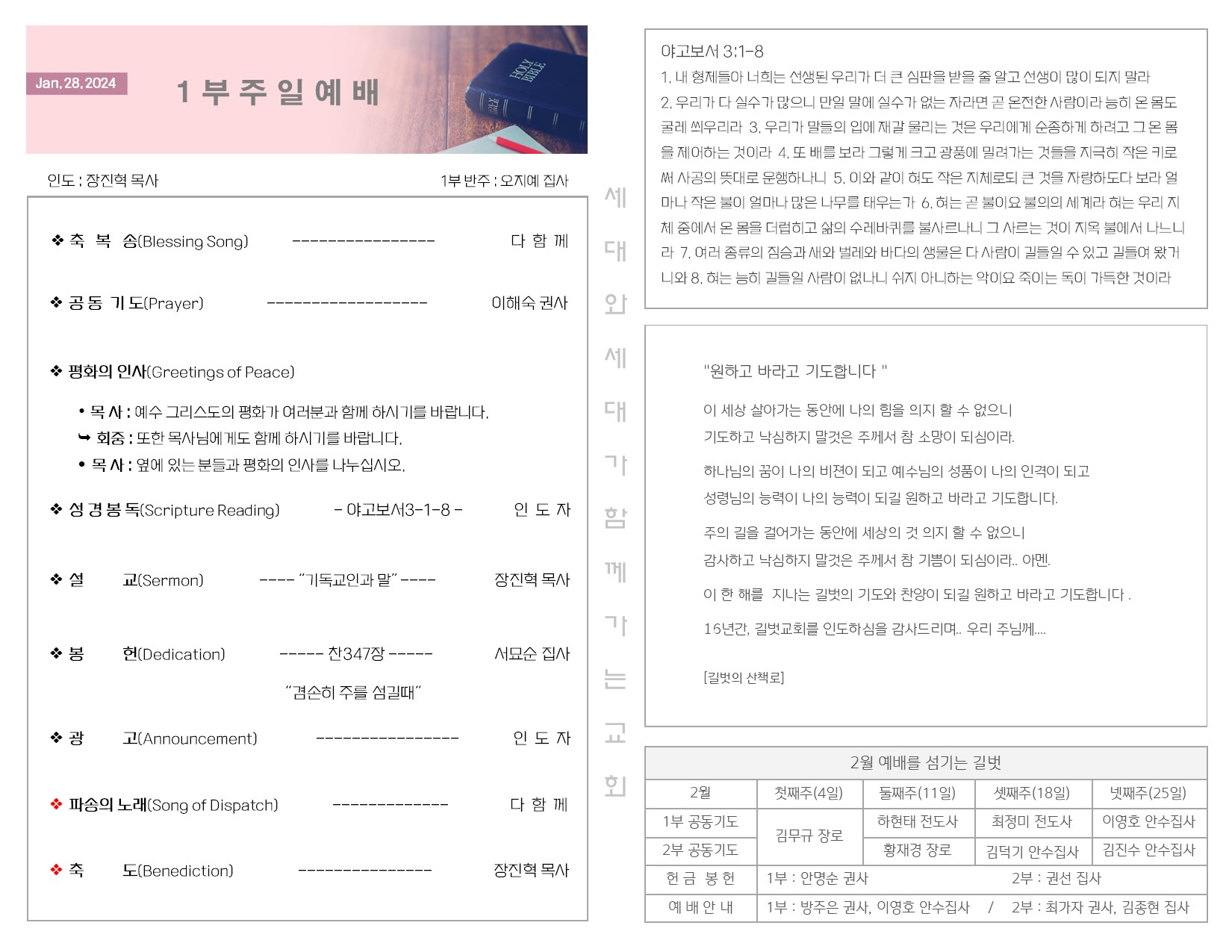 1월 28일 주일 예배 주보 Publish on January 30,2024 | 길벗교회 페이지 정보 작성자 길벗교회 댓글 0건 조회 2,022회 작성일 24-01-30 05:58 목록 본문 1월 28일 주일 예배 주보 이전글2월 4일 설립주일 예배 24.02.06 다음글1월 21일 주일 예배 주보 24.01.23 댓글 0 댓글목록 등록된 댓글이 없습니다. 목록