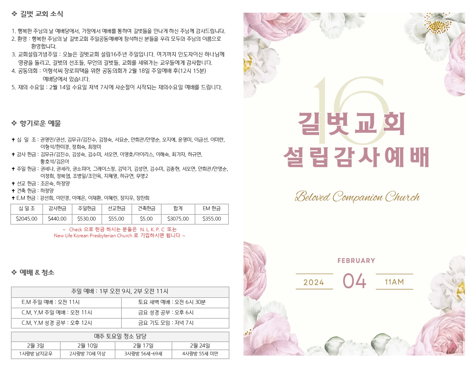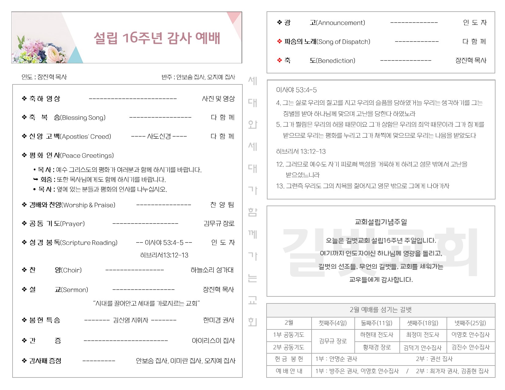 2월 4일 설립주일 예배 Publish on February 06,2024 | 길벗교회 페이지 정보 작성자 길벗교회 댓글 0건 조회 1,609회 작성일 24-02-06 04:56 목록 본문 2월 4일 설립주일 예배 이전글2월 11일 주일 예배 주보 24.02.13 다음글1월 28일 주일 예배 주보 24.01.30 댓글 0 댓글목록 등록된 댓글이 없습니다. 목록