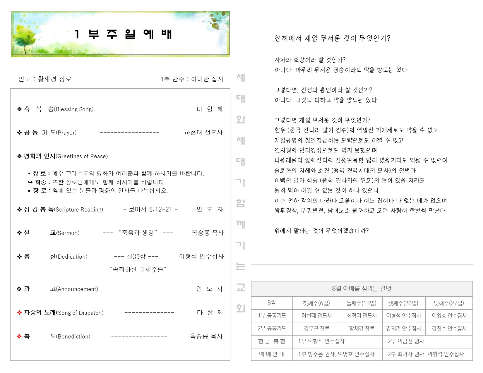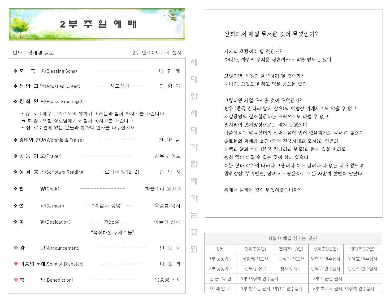 8월 6일 주일 예배 주보 Publish on August 08,2023 | 길벗교회 페이지 정보 작성자 길벗교회 댓글 0건 조회 1,226회 작성일 23-08-08 04:18 목록 본문 8월 6일 주일 예배 주보 이전글8월 13일 주일 예배 주보 23.08.15 다음글7월 30일 주일 예배 주보 23.08.01 댓글 0 댓글목록 등록된 댓글이 없습니다. 목록