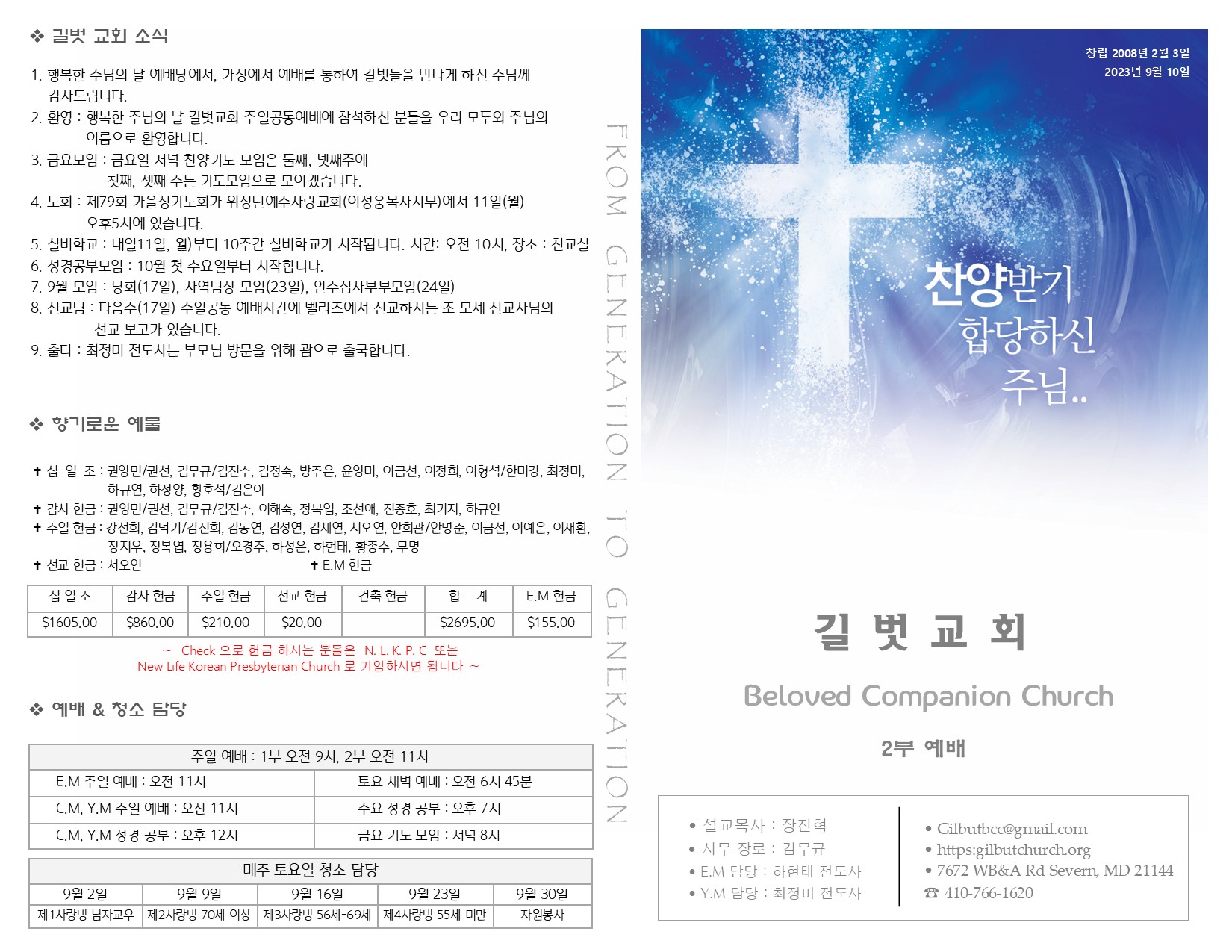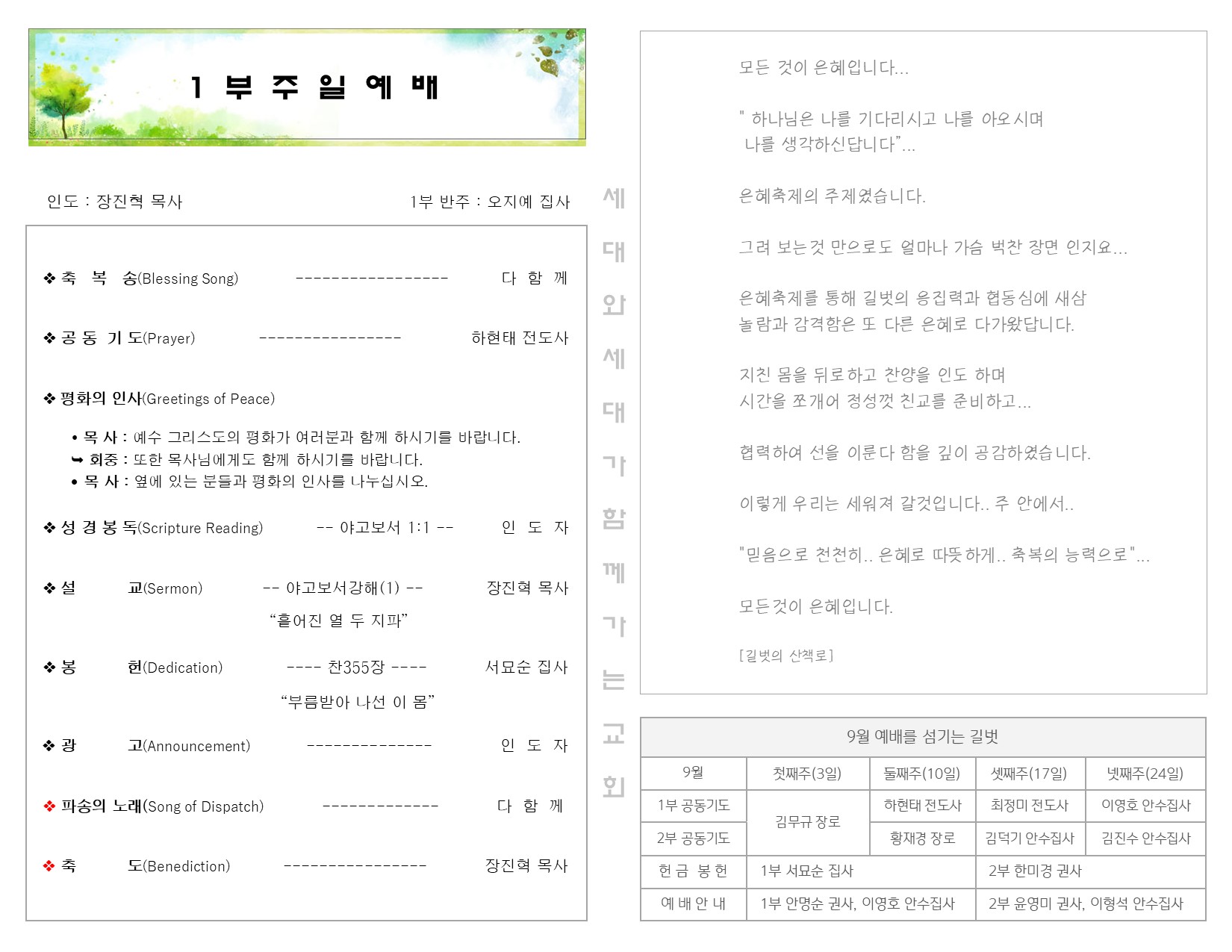 9월 10일 주일 예배 주보 Publish on September 12,2023 | 길벗교회 페이지 정보 작성자 길벗교회 댓글 0건 조회 1,473회 작성일 23-09-12 12:59 목록 본문 9월 10일 주일 예배 주보 이전글9월 17일 주일 예배 주보 23.09.20 다음글9월 3일 주일 예배 주보 23.09.06 댓글 0 댓글목록 등록된 댓글이 없습니다. 목록