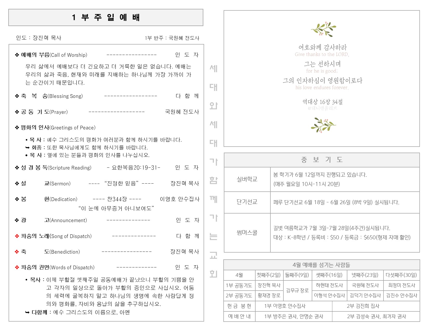 4월 23일 주일 예배 주보 Publish on April 25,2023 | 길벗교회 페이지 정보 작성자 길벗교회 댓글 0건 조회 1,784회 작성일 23-04-25 03:55 목록 본문 4월 23일 주일 예배 주보 이전글4월 30일 주일 예배 주보 23.05.02 다음글4월 16일 주일 예배 주보 23.04.17 댓글 0 댓글목록 등록된 댓글이 없습니다. 목록