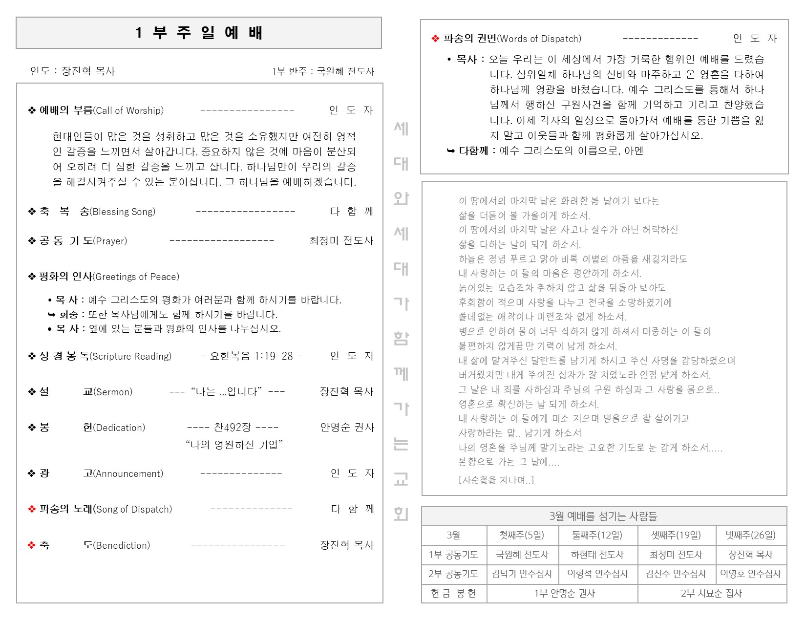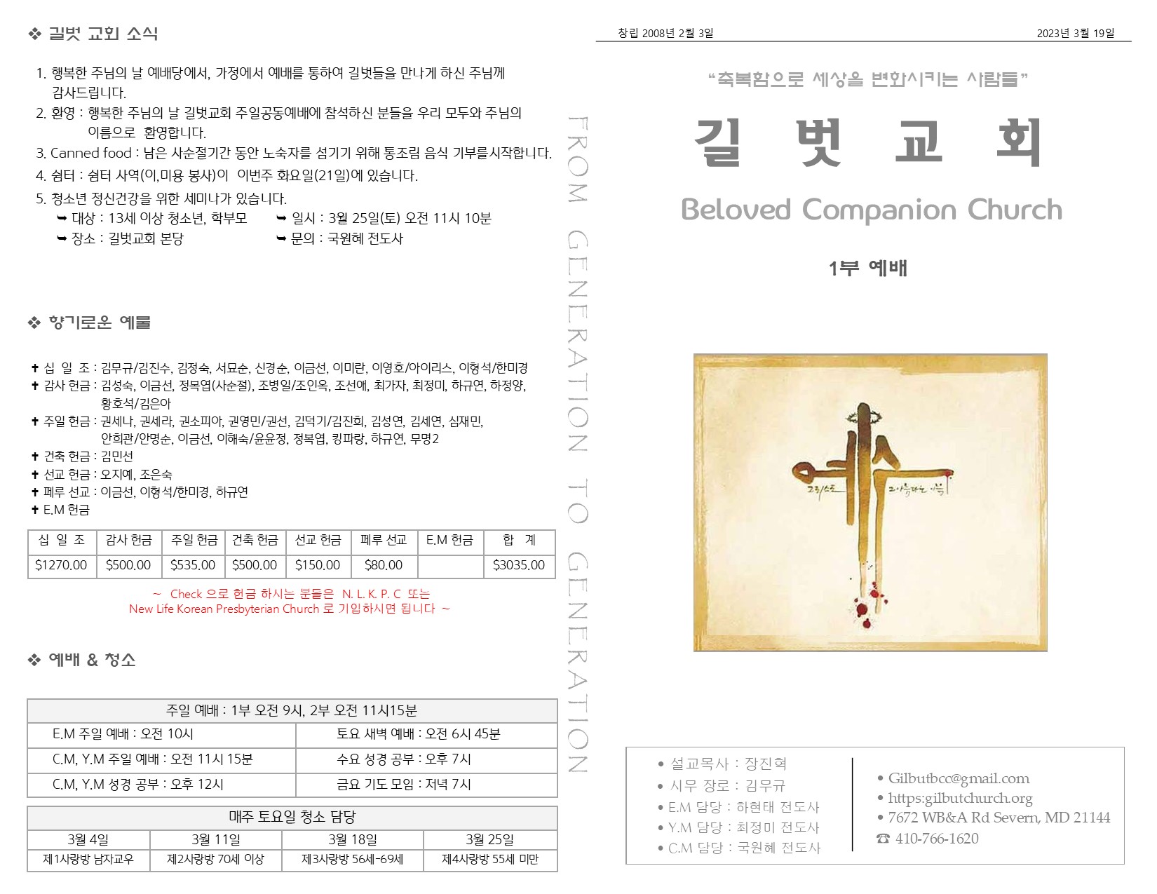 3월 19일 주일 예배 주보 Publish on March 20,2023 | 길벗교회 페이지 정보 작성자 길벗교회 댓글 0건 조회 1,707회 작성일 23-03-20 04:29 목록 본문 3월 19일 주일 예배 주보 이전글3월 26일 주일 예배 주보 23.03.28 다음글3월 12일 주일 예배 주보 23.03.14 댓글 0 댓글목록 등록된 댓글이 없습니다. 목록