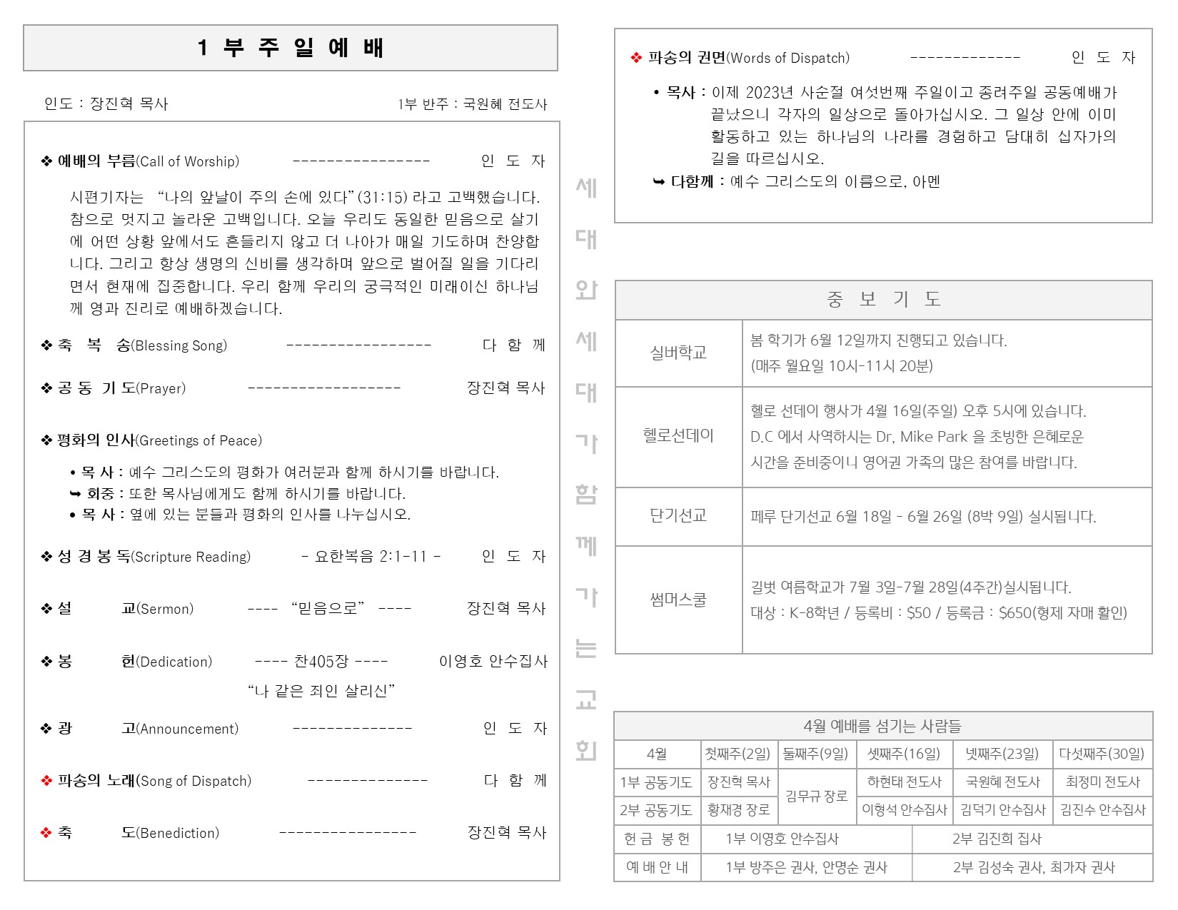 4월 2일 주일 예배 주보 Publish on April 04,2023 | 길벗교회 페이지 정보 작성자 길벗교회 댓글 0건 조회 1,802회 작성일 23-04-04 05:26 목록 본문 4월 2일 주일 예배 주보 이전글2023년 4월 9일 부활주일 예배 23.04.10 다음글3월 26일 주일 예배 주보 23.03.28 댓글 0 댓글목록 등록된 댓글이 없습니다. 목록