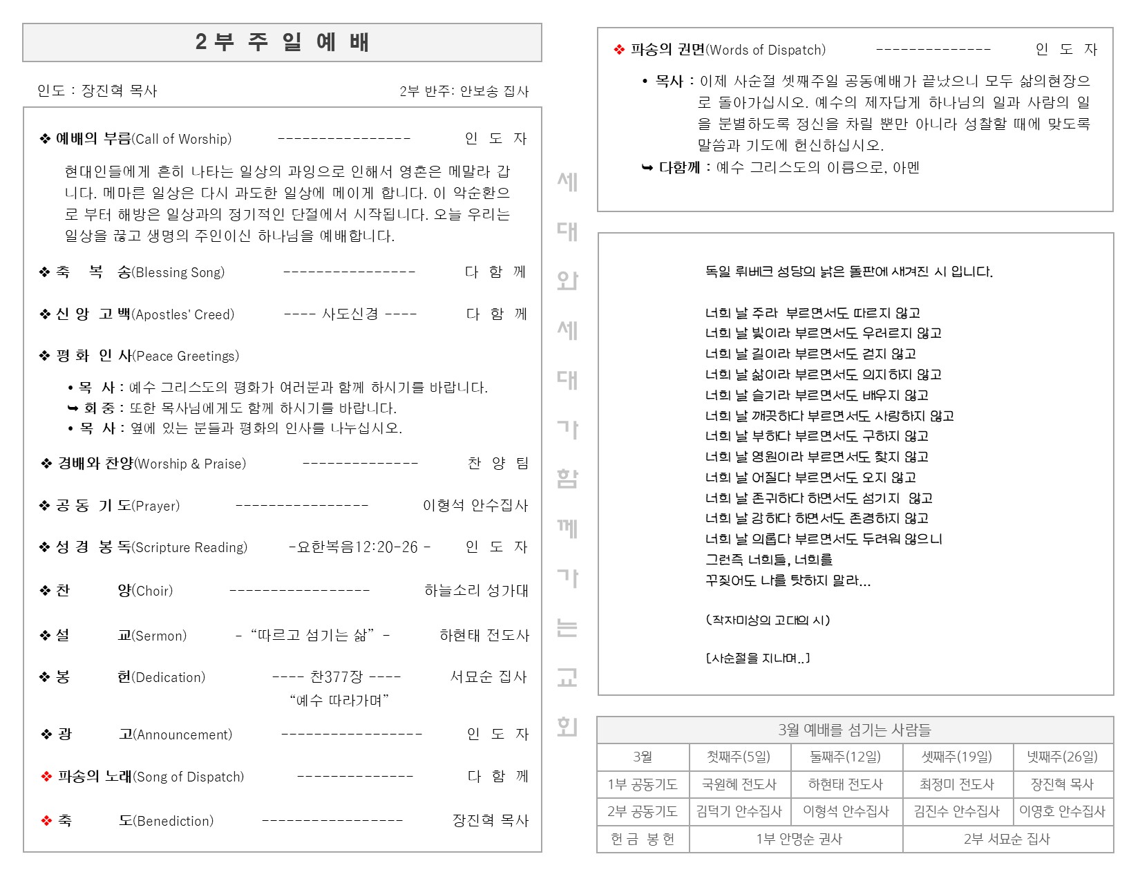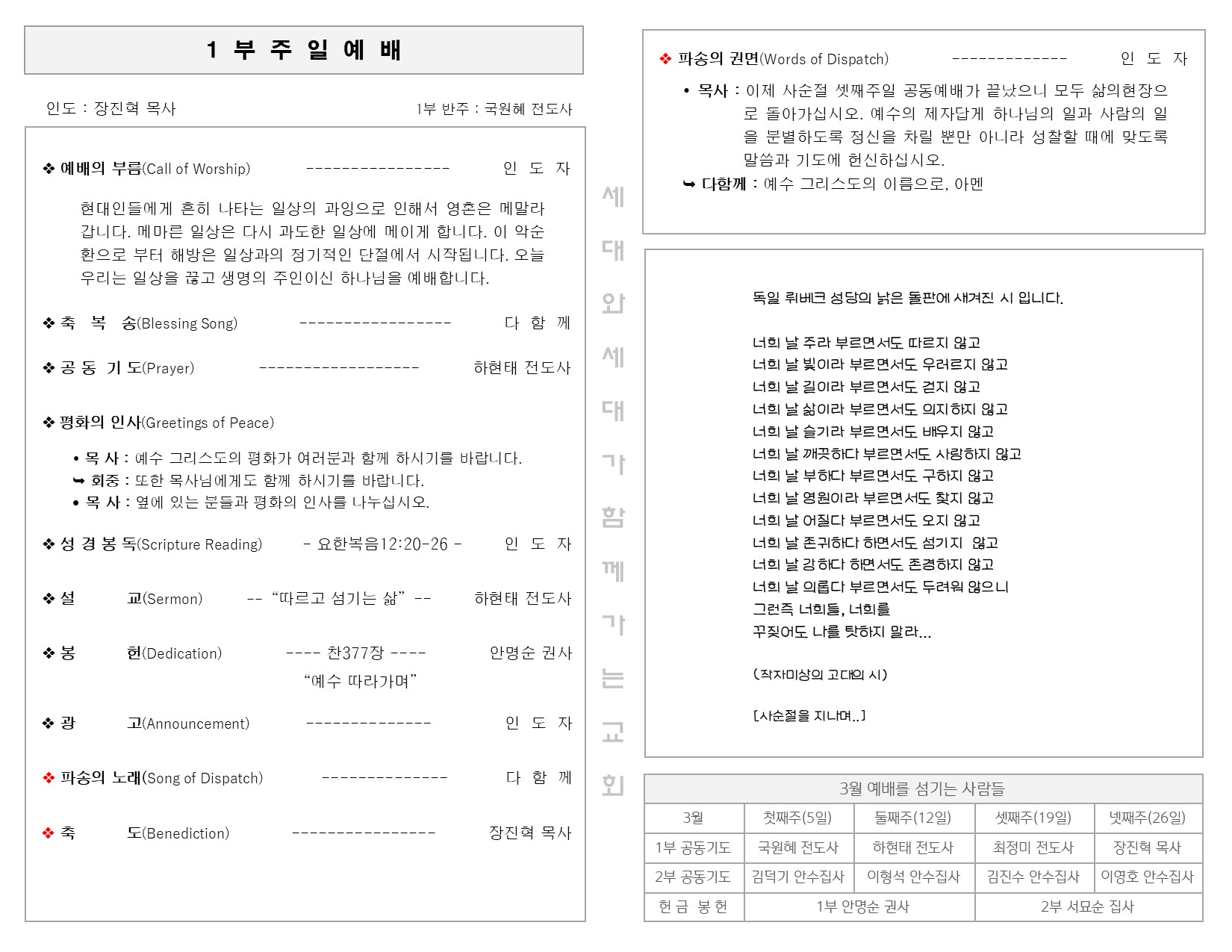 3월 12일 주일 예배 주보 Publish on March 14,2023 | 길벗교회 페이지 정보 작성자 길벗교회 댓글 0건 조회 2,167회 작성일 23-03-14 06:24 목록 본문 3월 12일 주일 예배 주보 이전글3월 19일 주일 예배 주보 23.03.20 다음글3월 5일 주일 예배 주보 23.03.06 댓글 0 댓글목록 등록된 댓글이 없습니다. 목록