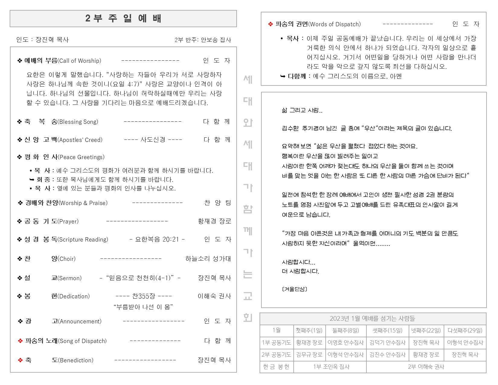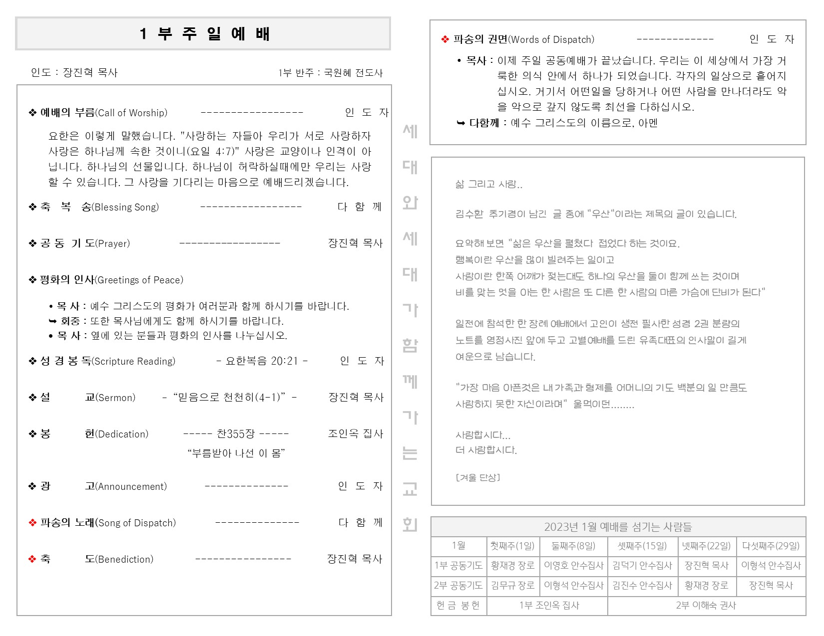 1월 22일 주일 예배 주보 Publish on January 23,2023 | 길벗교회 페이지 정보 작성자 길벗교회 댓글 0건 조회 2,173회 작성일 23-01-23 08:37 목록 본문 1월 22일 주일 예배 주보 이전글1월 29일 주일 예배 주보 23.02.01 다음글1월 15일 주일 예배 주보 23.01.17 댓글 0 댓글목록 등록된 댓글이 없습니다. 목록