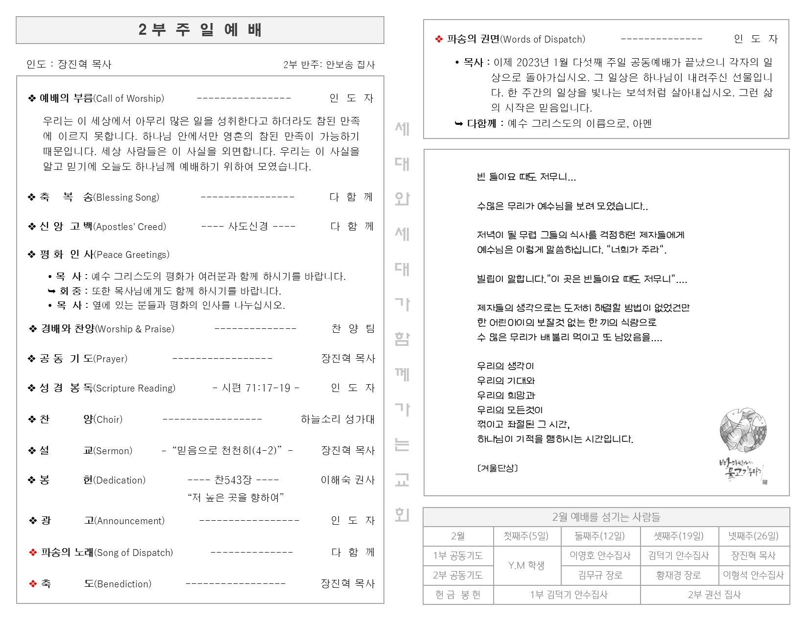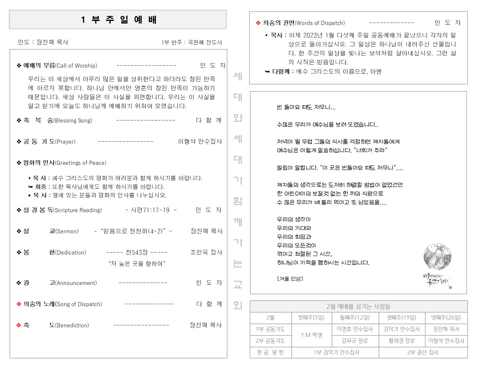 1월 29일 주일 예배 주보 Publish on February 01,2023 | 길벗교회 페이지 정보 작성자 길벗교회 댓글 0건 조회 2,201회 작성일 23-02-01 06:21 목록 본문 1월 29일 주일 예배 주보 이전글2월 5일 창립15주년 예배 주보 23.02.07 다음글1월 22일 주일 예배 주보 23.01.23 댓글 0 댓글목록 등록된 댓글이 없습니다. 목록