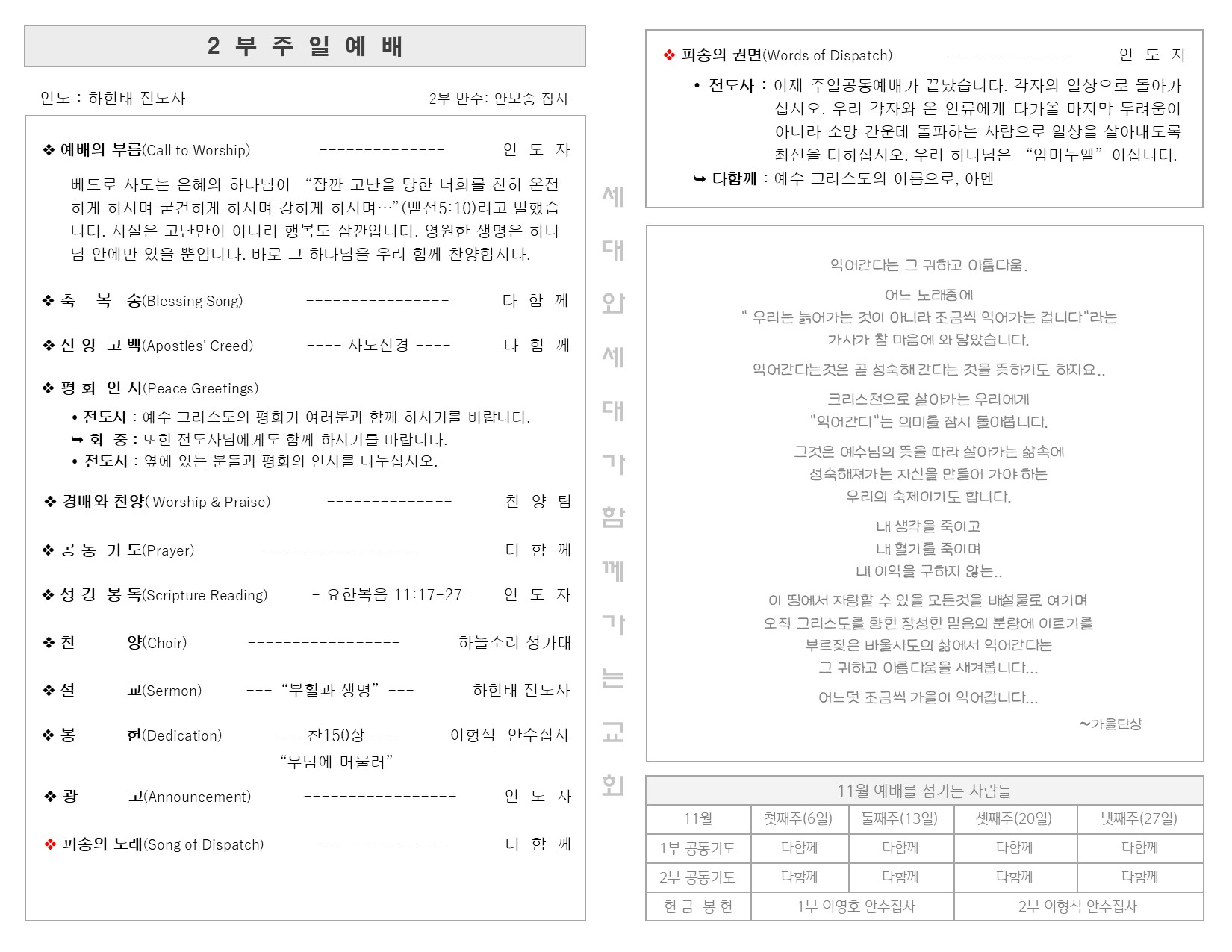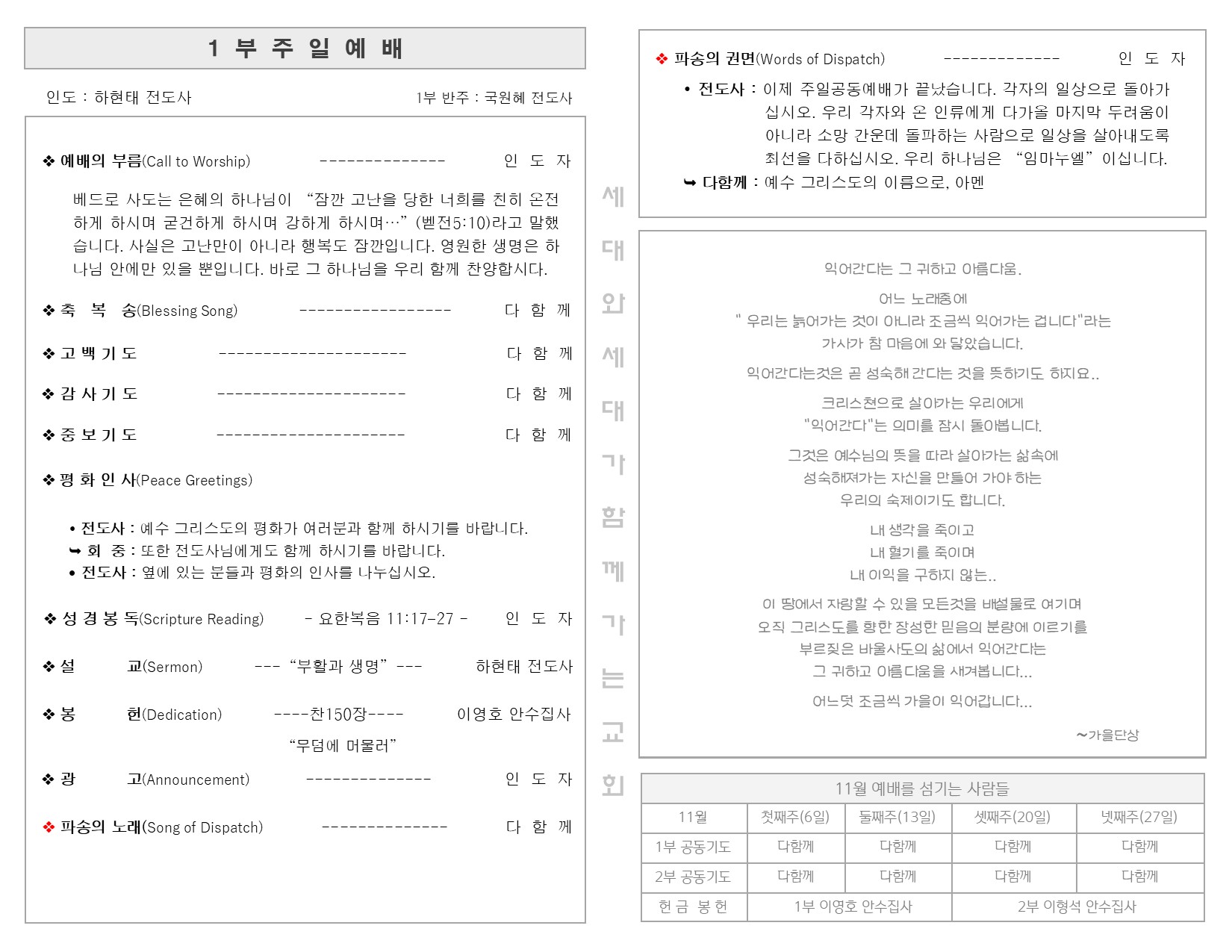 11월 13일 주일예배 주보 Publish on November 15,2022 | 길벗교회 페이지 정보 작성자 길벗교회 댓글 0건 조회 1,813회 작성일 22-11-15 05:05 목록 본문 11월 13일 주일예배 주보 이전글11월 20일 추수감사주일예배 주보 22.11.23 다음글11월 6일 주일예배 주보 22.11.10 댓글 0 댓글목록 등록된 댓글이 없습니다. 목록
