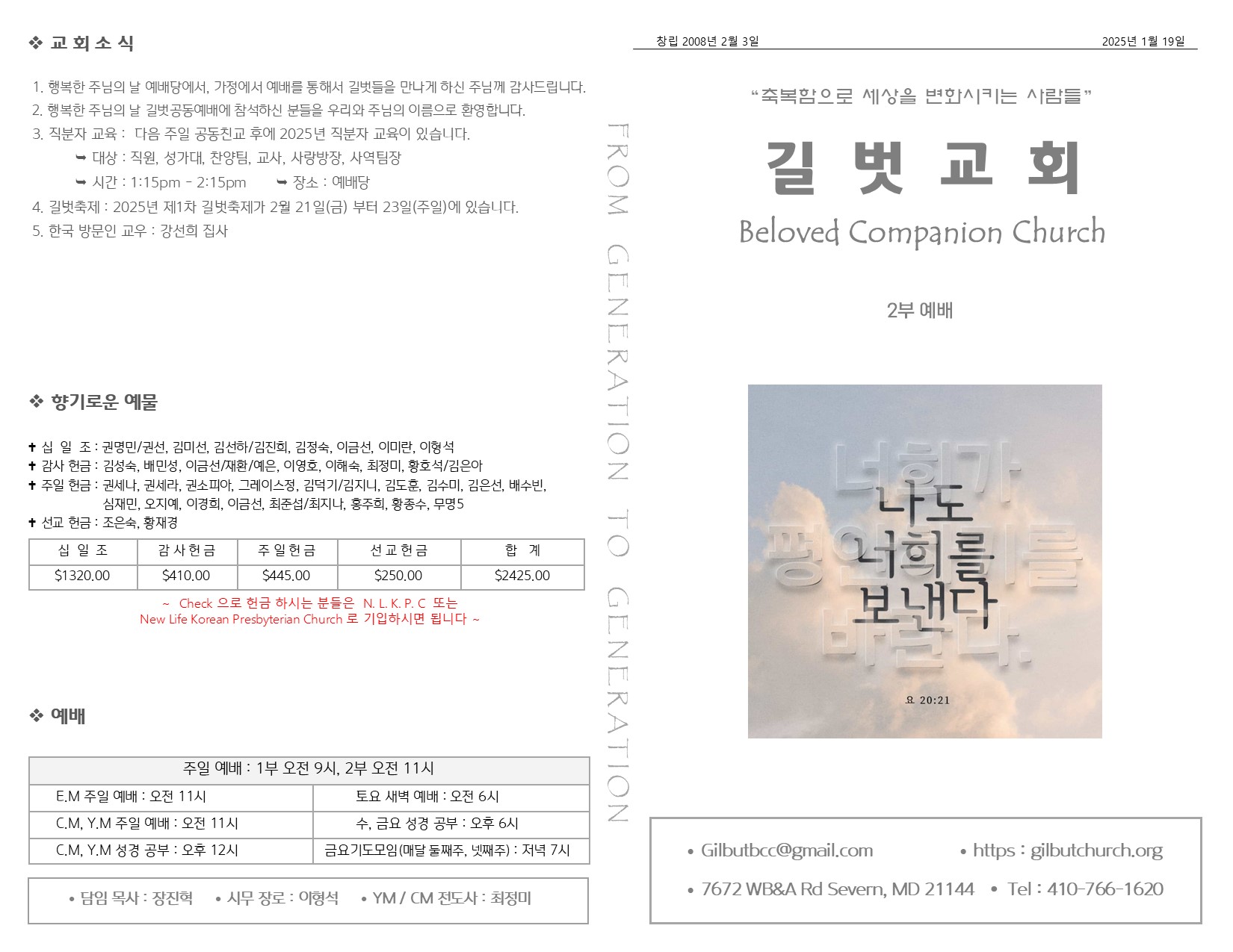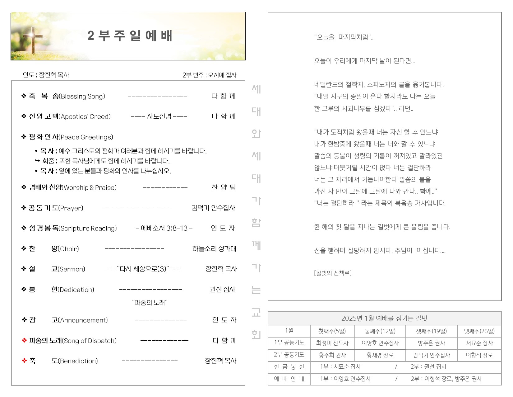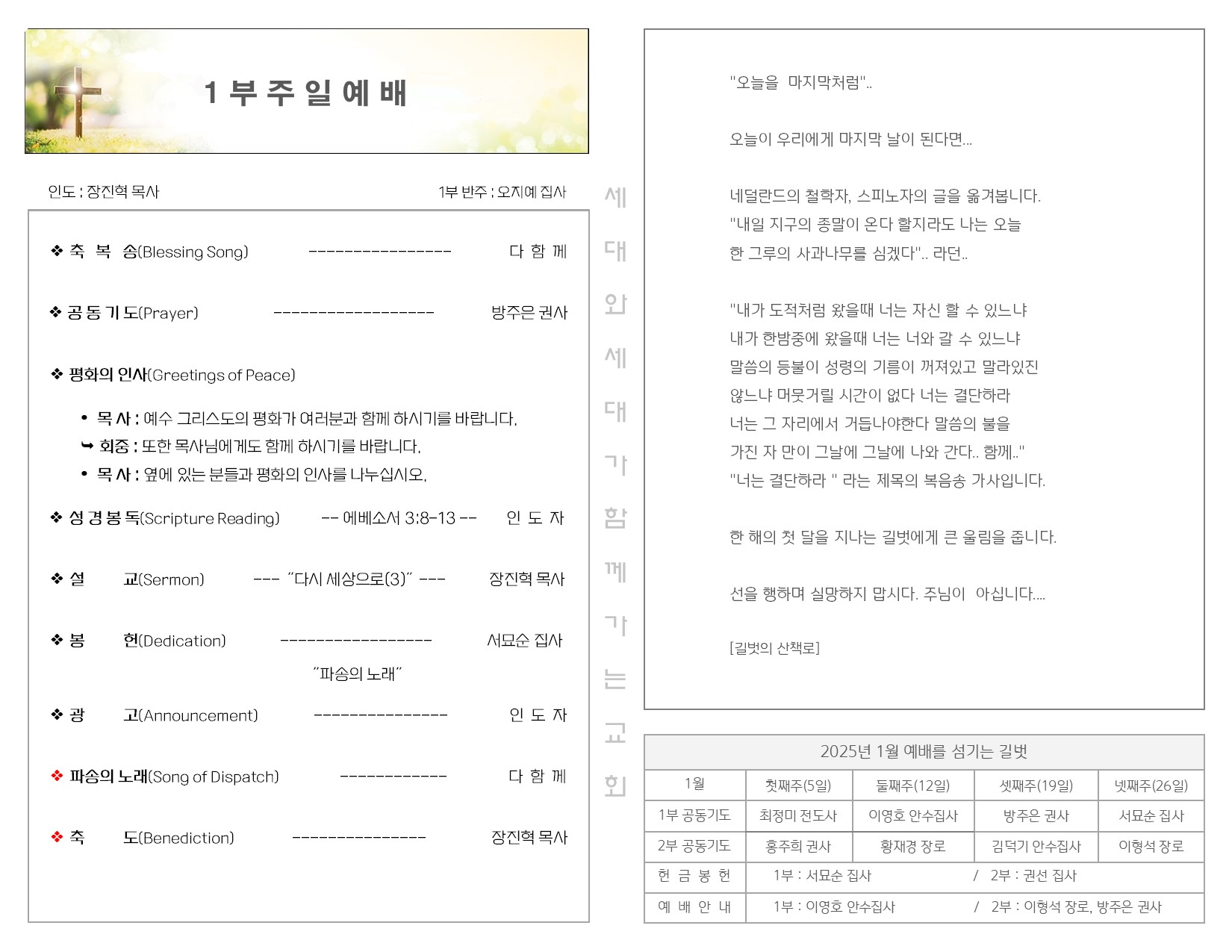 1월 19일 주일 예배 주보 Publish on January 22,2025 | 길벗교회 페이지 정보 작성자 길벗교회 댓글 0건 조회 839회 작성일 25-01-22 07:34 목록 본문 1월 19일 주일 예배 주보 이전글1월 26일 주일 예배 주보 25.01.28 다음글1월 12일 주일 예배 주보 25.01.15 댓글 0 댓글목록 등록된 댓글이 없습니다. 목록