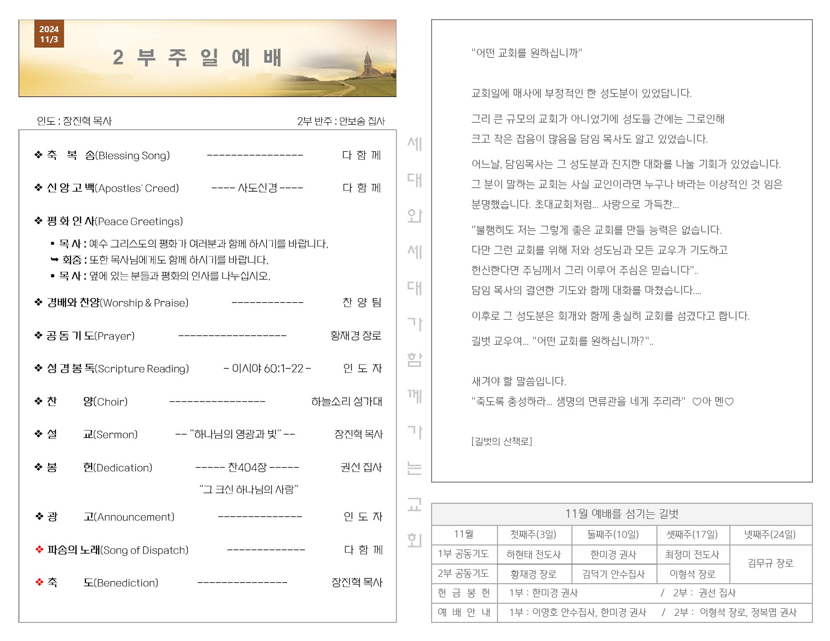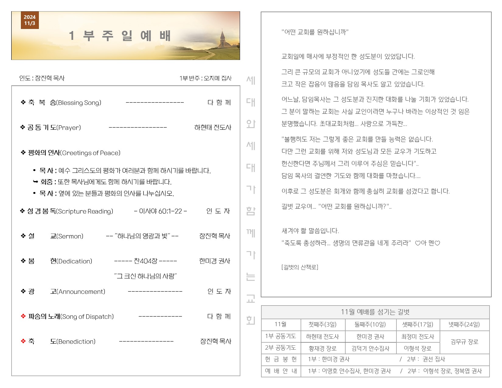 11월 3일 주일 예배 주보 Publish on November 06,2024 | 길벗교회 페이지 정보 작성자 길벗교회 댓글 0건 조회 1,043회 작성일 24-11-06 05:18 목록 본문 11월 3일 주일 예배 주보 이전글11월 10일 주일 예배 주보 24.11.12 다음글10월 27일 주일 예배 주보 24.10.29 댓글 0 댓글목록 등록된 댓글이 없습니다. 목록
