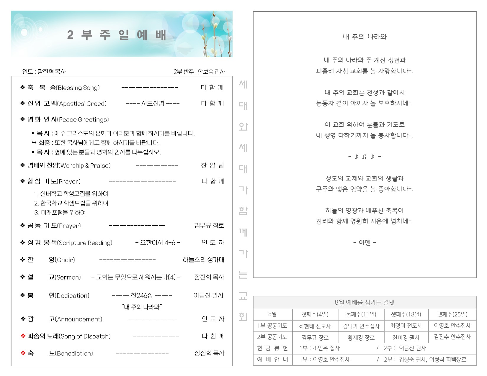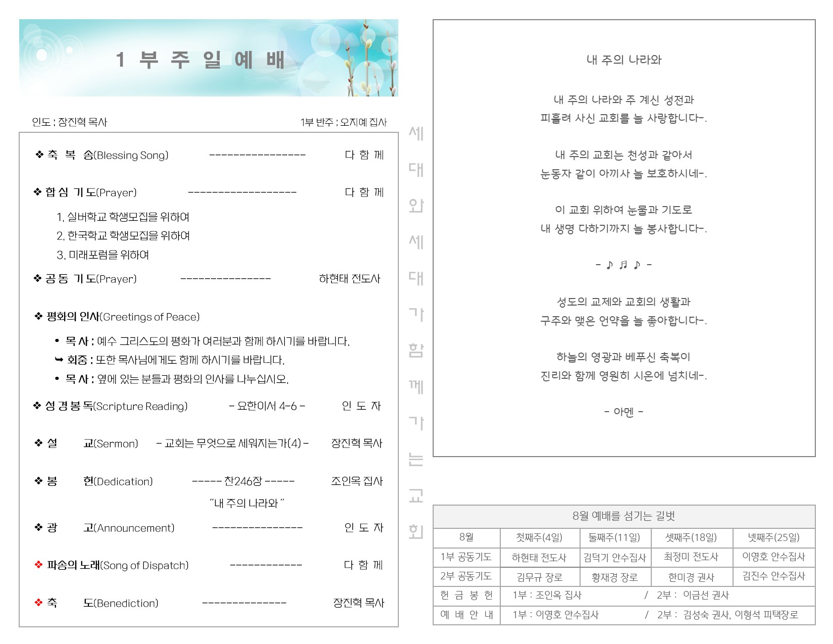 8월 4일 주일 예배 주보 Publish on August 06,2024 | 길벗교회 페이지 정보 작성자 길벗교회 댓글 0건 조회 1,016회 작성일 24-08-06 16:36 목록 본문 8월 4일 주일 예배 주보 이전글8월 11일 주일 예배 주보 24.08.13 다음글7월 28일 주일 예배 주보 24.07.30 댓글 0 댓글목록 등록된 댓글이 없습니다. 목록