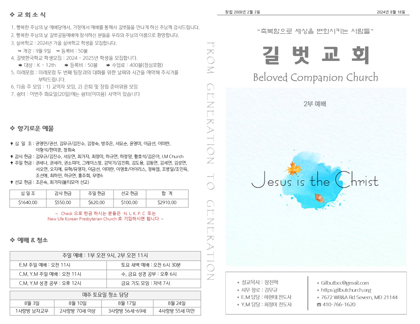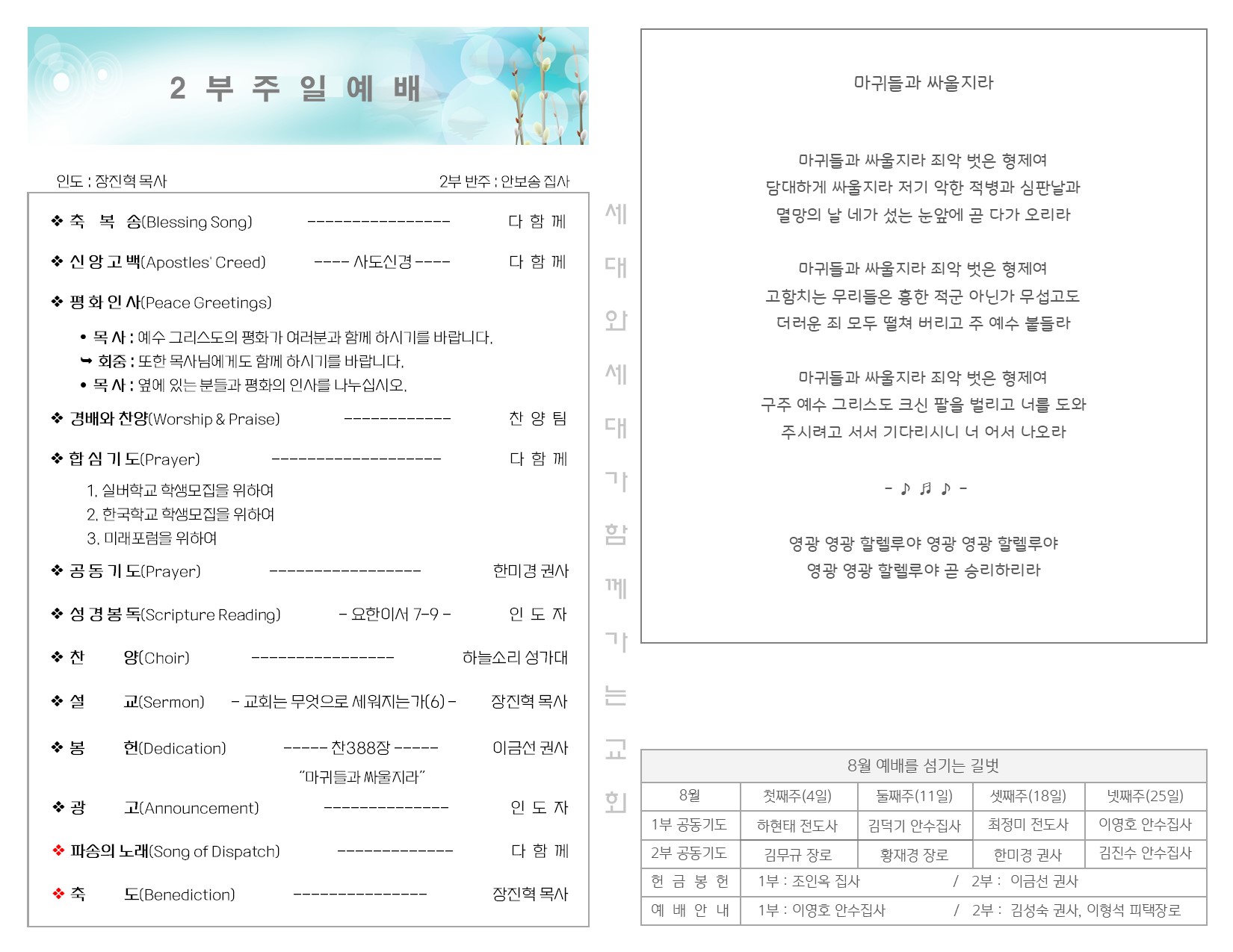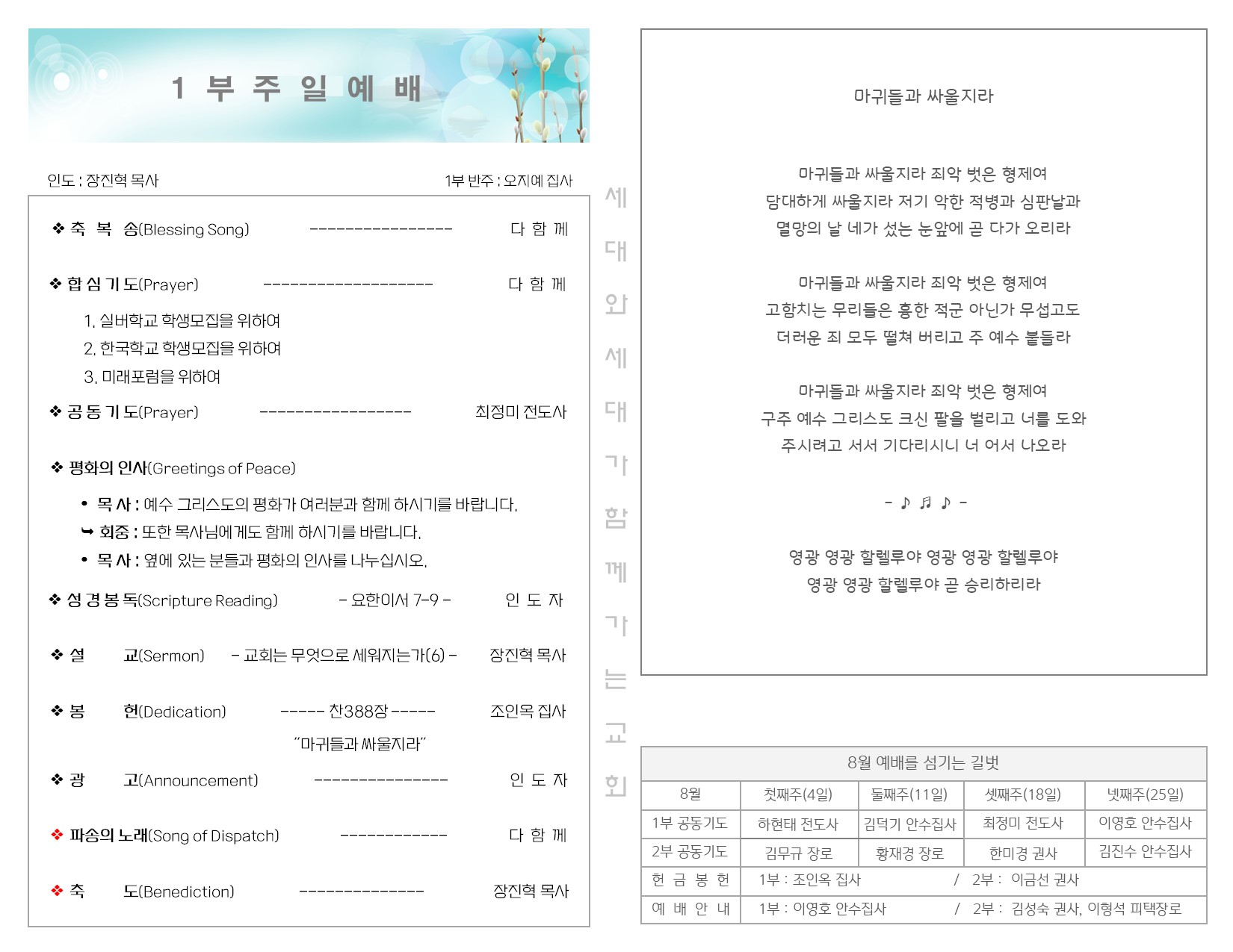 8월 18일 주일 예배 주보 Publish on August 21,2024 | 길벗교회 페이지 정보 작성자 길벗교회 댓글 0건 조회 1,135회 작성일 24-08-21 04:34 목록 본문 8월 18일 주일 예배 주보 이전글8월 25일 주일 예배 주보 24.08.27 다음글8월 11일 주일 예배 주보 24.08.13 댓글 0 댓글목록 등록된 댓글이 없습니다. 목록