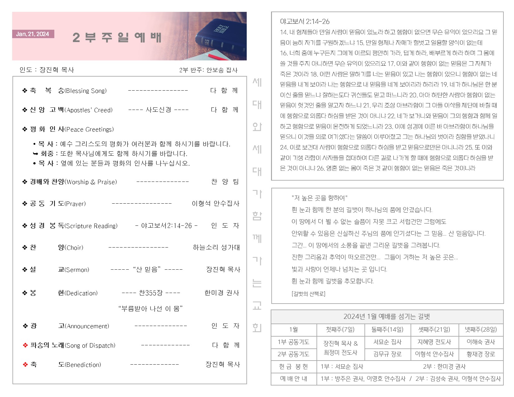 1월 21일 주일 예배 주보 Publish on January 23,2024 | 길벗교회 페이지 정보 작성자 길벗교회 댓글 0건 조회 1,996회 작성일 24-01-23 05:49 목록 본문 1월 21일 주일 예배 주보 이전글1월 28일 주일 예배 주보 24.01.30 다음글1월 14일 주일 예배 주보 24.01.16 댓글 0 댓글목록 등록된 댓글이 없습니다. 목록