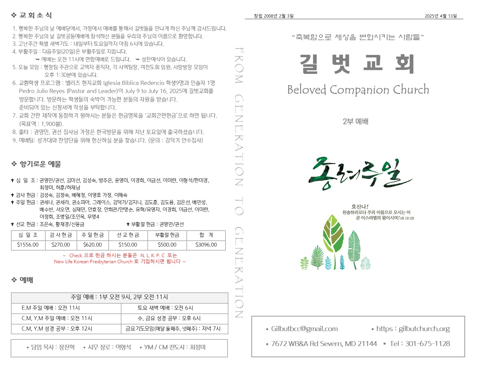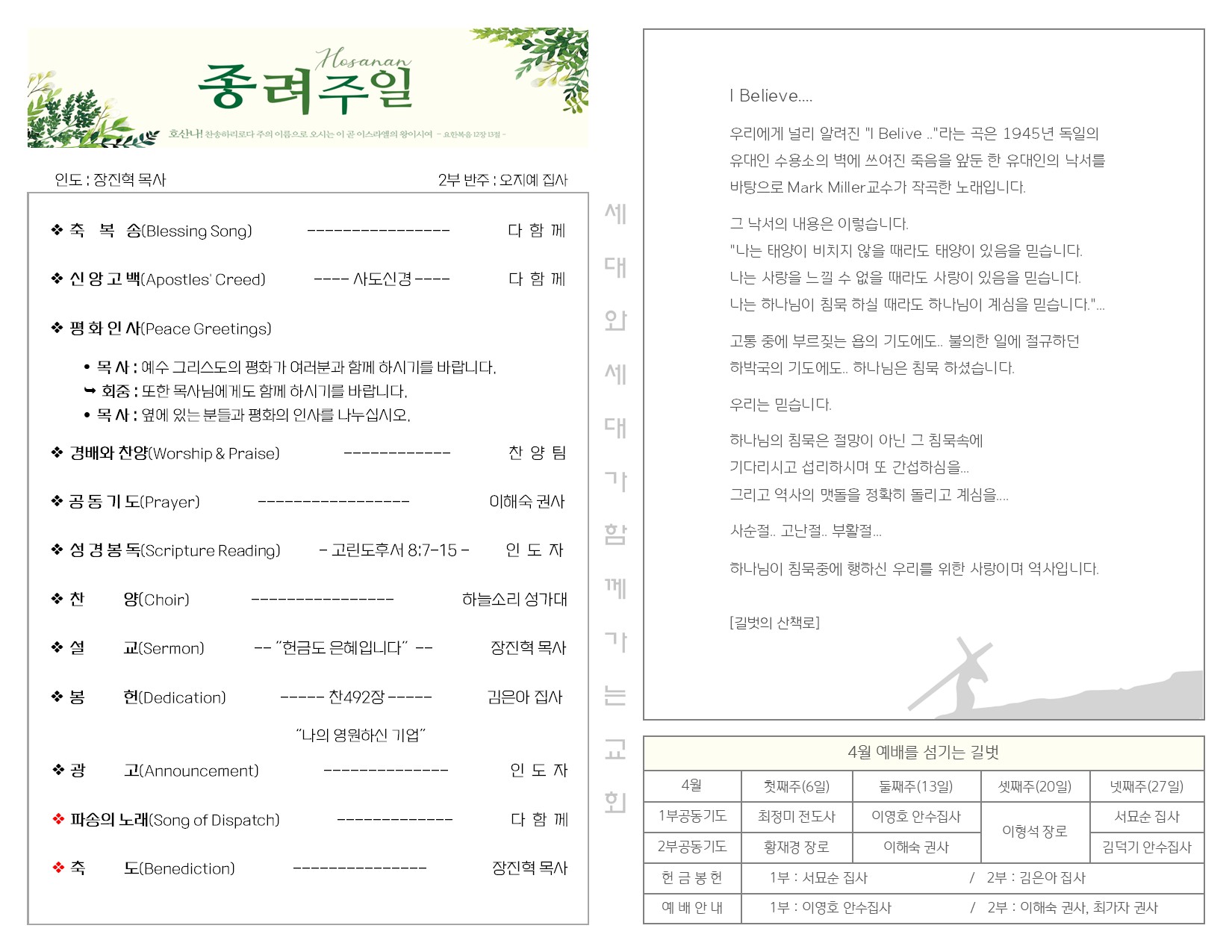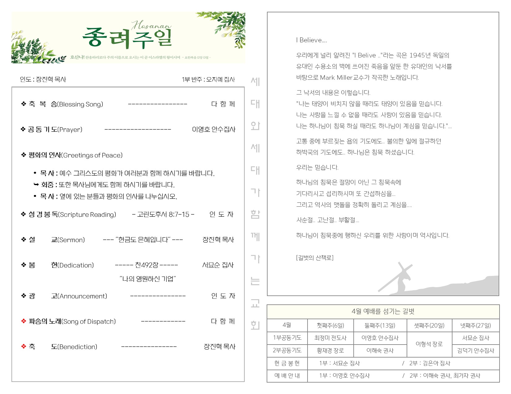4월 13일 주일 예배 주보 Publish on April 16,2025 | 길벗교회 페이지 정보 작성자 길벗교회 댓글 0건 조회 910회 작성일 25-04-16 04:30 목록 본문 4월 13일 주일 예배 주보 이전글4월 20일 부활절 주일 예배 25.04.22 다음글4월 6일 주일 예배 주보 25.04.08 댓글 0 댓글목록 등록된 댓글이 없습니다. 목록