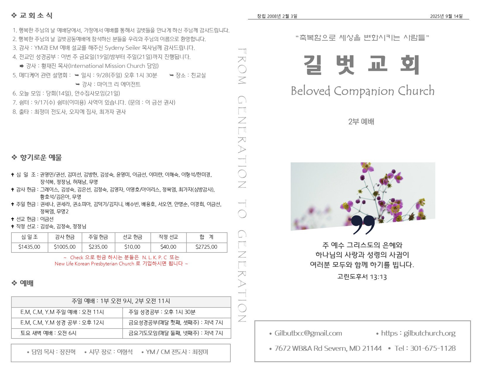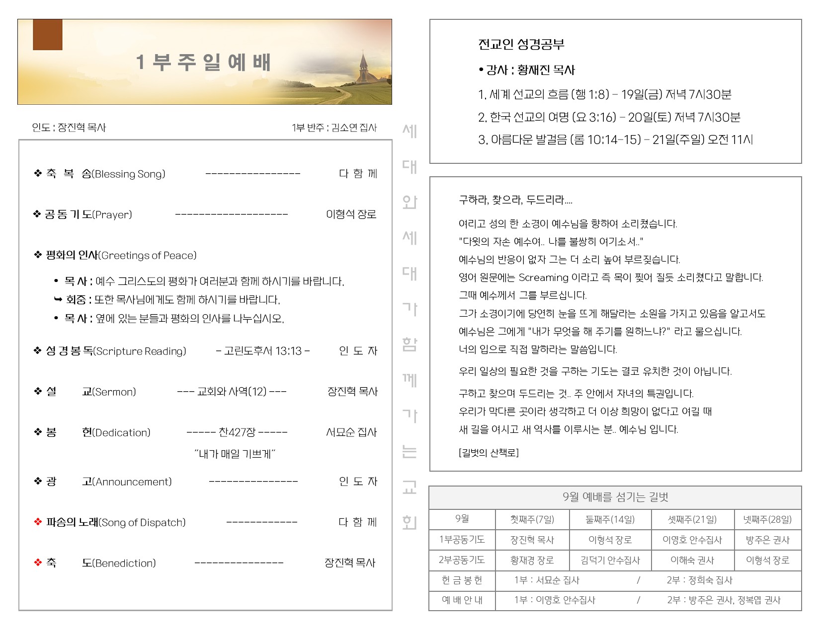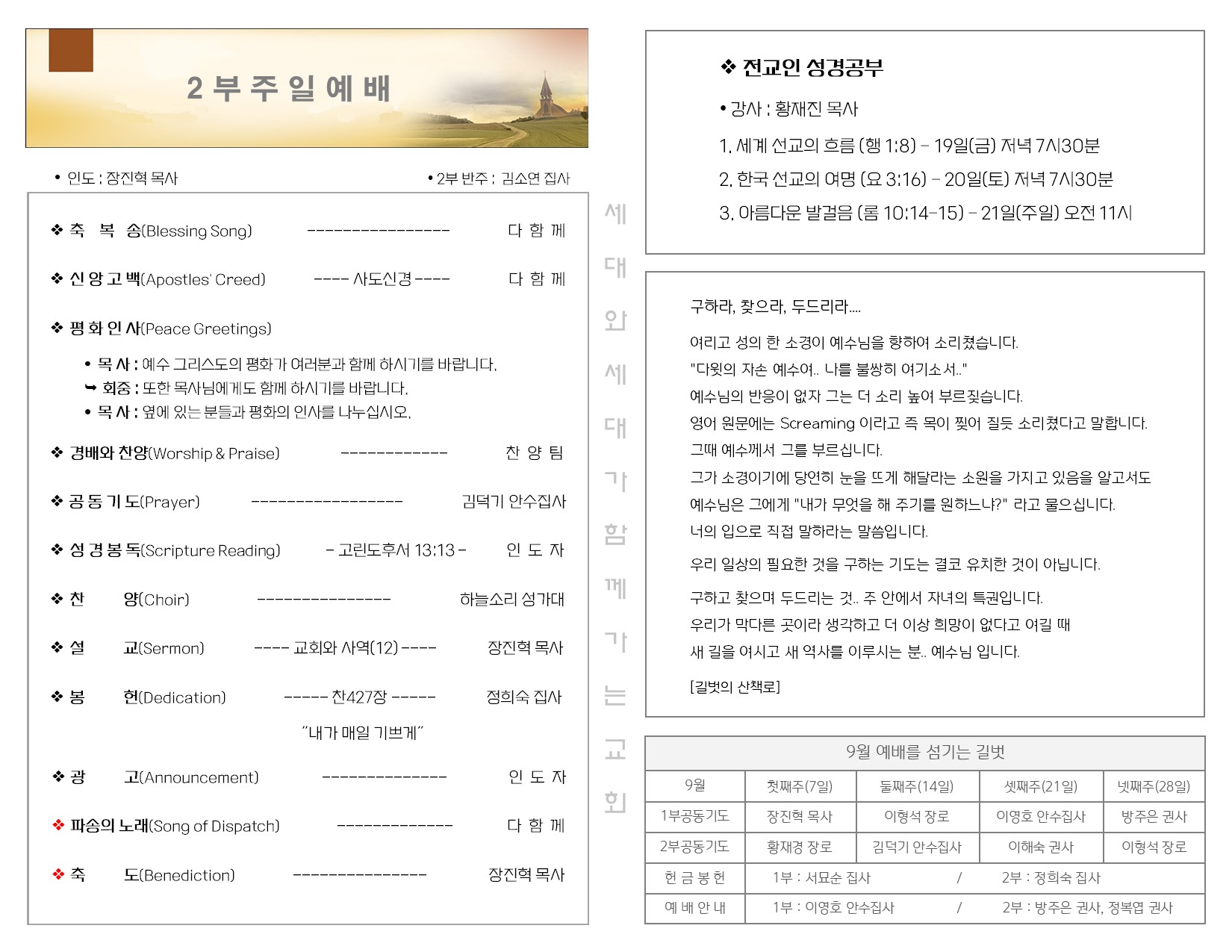 9월 14일 주일 예배 주보 Publish on September 16,2025 | 길벗교회 페이지 정보 작성자 길벗교회 댓글 0건 조회 336회 작성일 25-09-16 04:52 목록 본문 9월 14일 주일 예배 주보 이전글9월 21일 주일 예배 주보(전교인 성경공부19-21일) 25.09.23 다음글9월 7일 주일 예배 주보 25.09.09 댓글 0 댓글목록 등록된 댓글이 없습니다. 목록