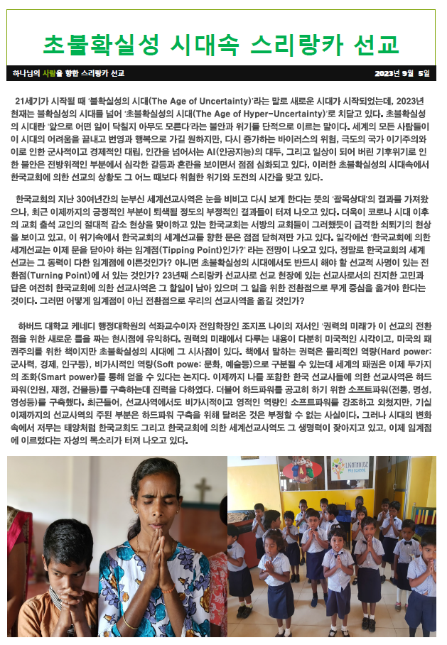 스리랑카 선교편지 페이지 정보 작성자 길벗교회 댓글 0건 조회 913회 작성일 23-09-06 04:38 목록 본문 중보기도는 성령하나님과 나와 선교사님을 하나로 묶어 선교사역을 하는 것입니다. 스리랑카 선교지와 하웅원, 정미연 선교사님을 위해 기도부탁합니다. 이전글가을 실버 학교 포스터 23.09.26 다음글스리랑카 선교편지 23.07.11 목록 댓글 0 댓글목록 등록된 댓글이 없습니다.