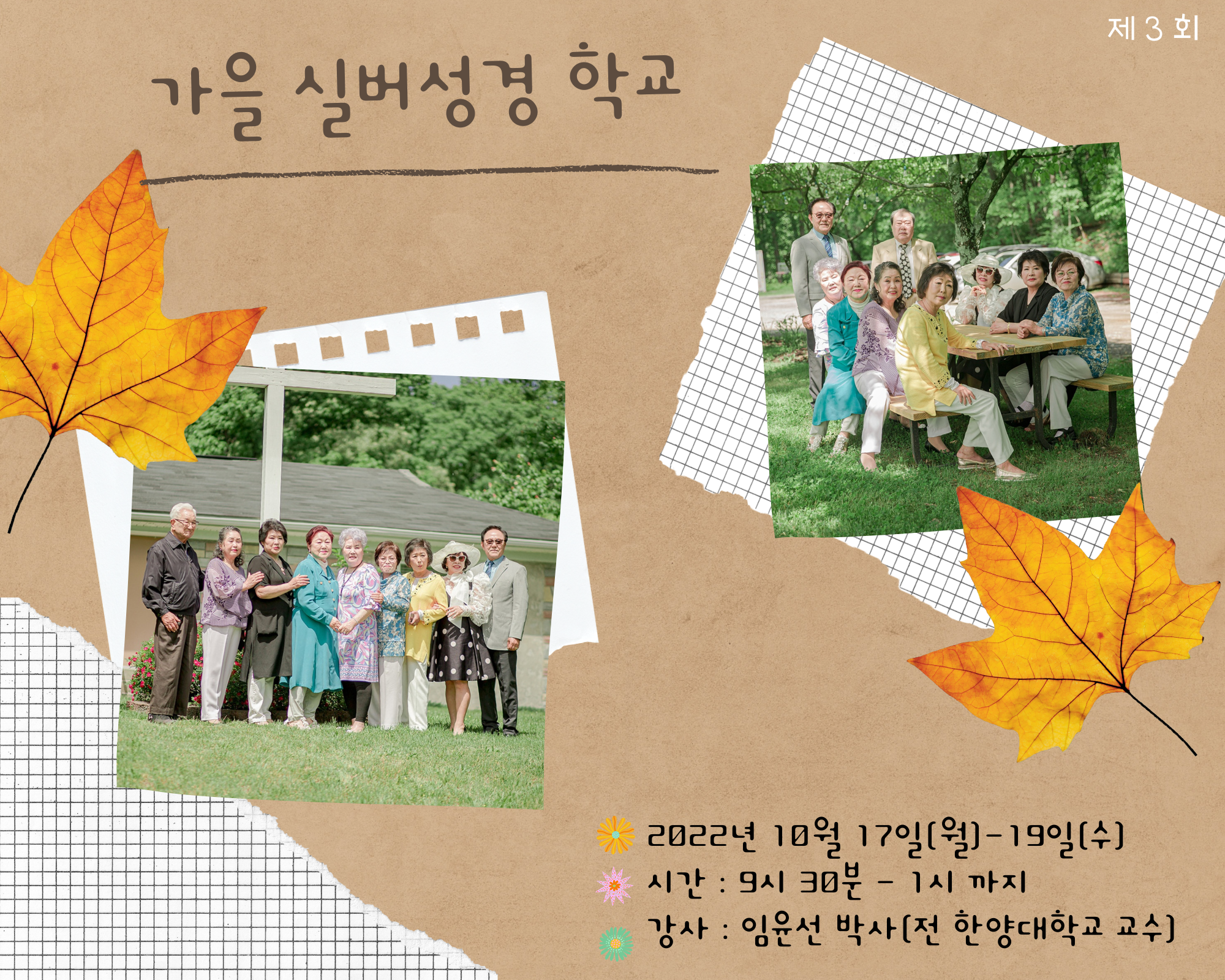 2022년 가을 실버성경학교가 10월 17일(월) 부터 19일(수)까지 열립니다.