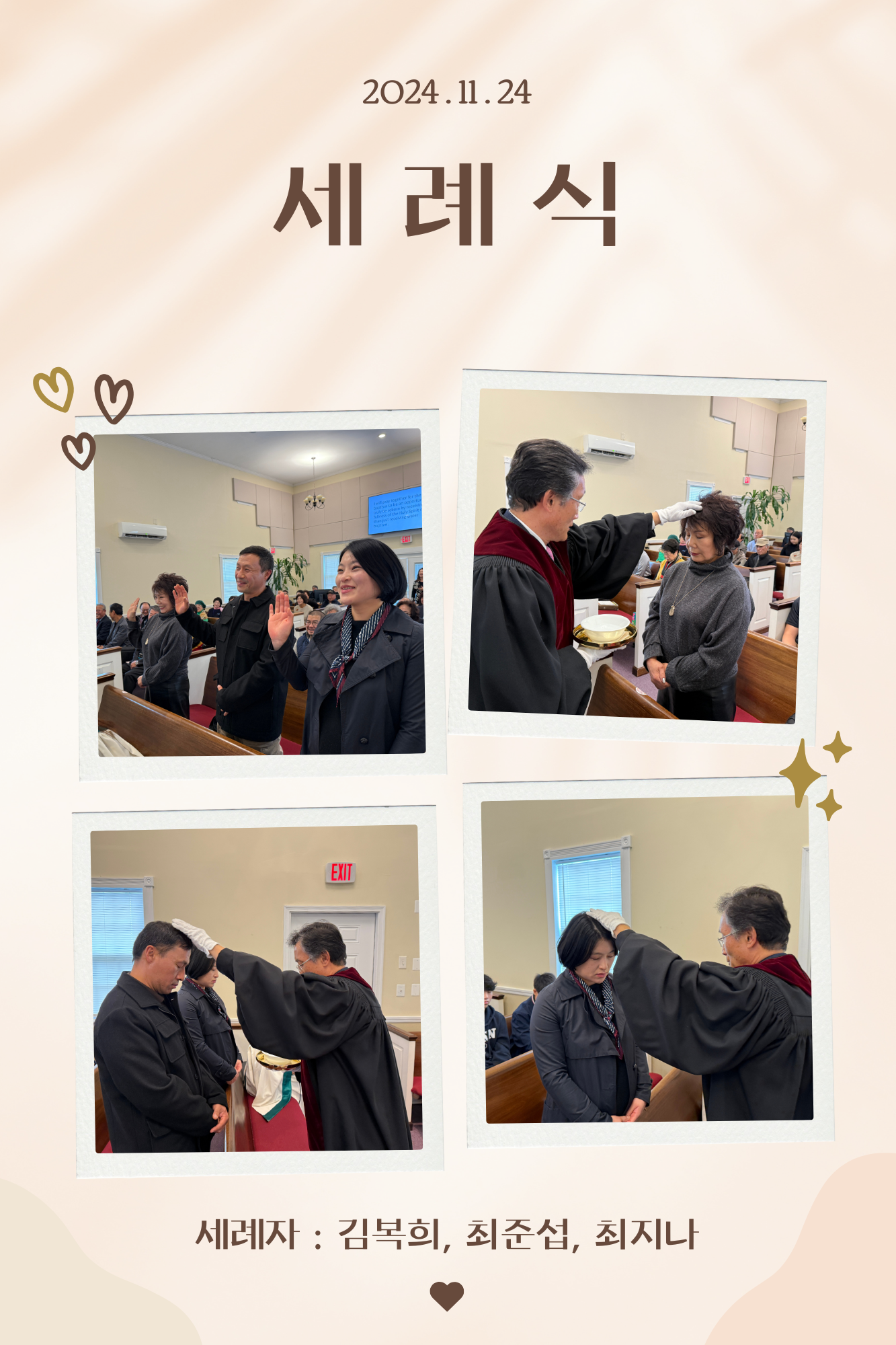 세례식 Publish on December 03,2024 | 길벗교회 페이지 정보 작성자 길벗교회 댓글 0건 조회 630회 작성일 24-12-03 05:14 목록 본문 세례식 11/24/24 추수감사주일세례자 : 김복희, 최준섭, 최지나 이전글2024 가을학기 길벗한국 학교 종강 24.12.18 다음글항존직 은퇴 & 임직예식 24.11.05 댓글 0 댓글목록 등록된 댓글이 없습니다. 목록