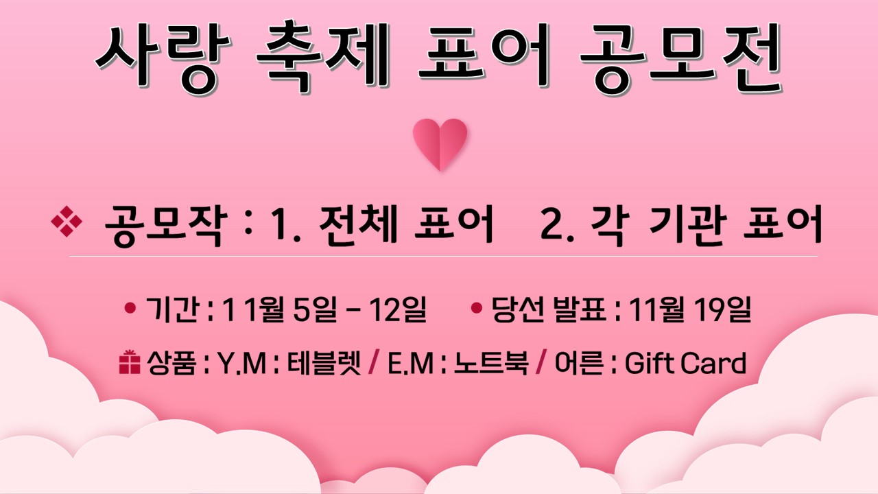 2023' 사랑축제 표어 공모전 Publish on November 07,2023 | 길벗교회 페이지 정보 작성자 길벗교회 댓글 0건 조회 2,047회 작성일 23-11-07 06:03 목록 본문 2023' 사랑축제 표어 공모전 이전글사랑축제 표어 공모 당선작 23.11.21 다음글2023' 전교인 가을 수련회 23.09.19 댓글 0 댓글목록 등록된 댓글이 없습니다. 목록