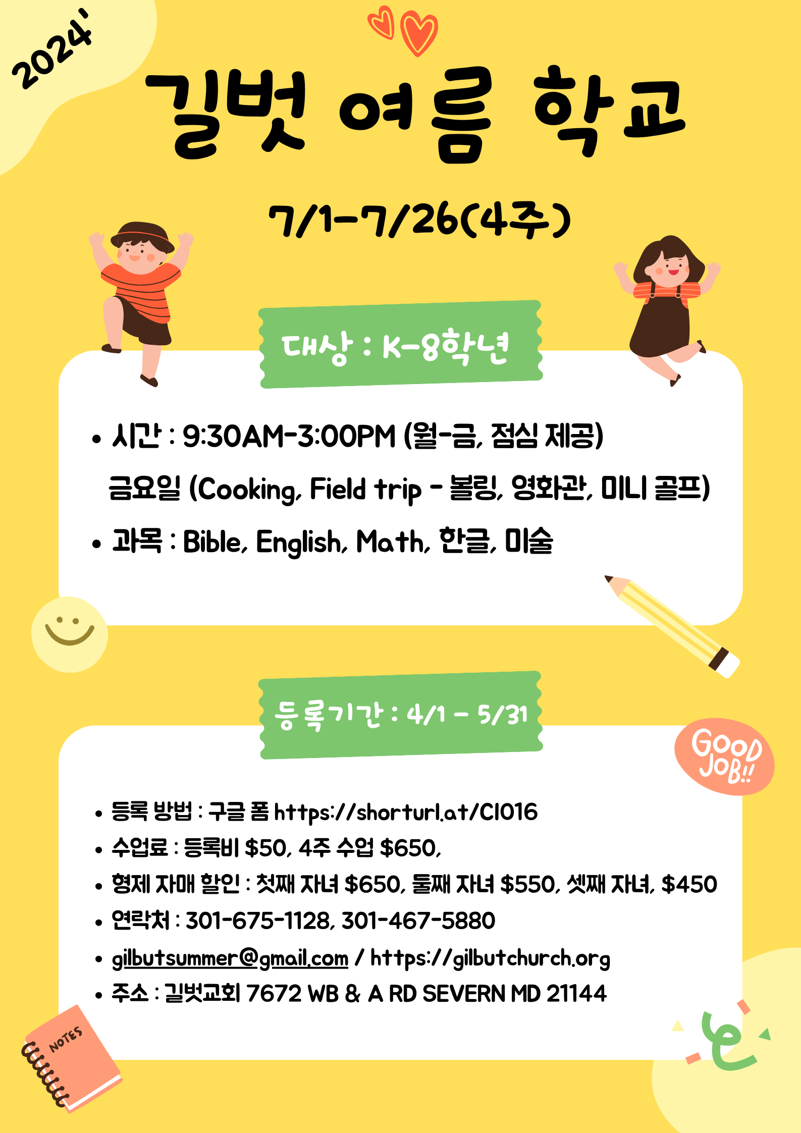 여름학교 2024 여름학교 포스터 Publish on April 02,2024 | 길벗교회 페이지 정보 작성자 길벗교회 댓글 0건 조회 1,420회 작성일 24-04-02 04:43 목록 본문 2024 여름학교 포스터 이전글여름학교 안내 24.04.02 다음글한국학교 신청서 Registration Form 23.08.09 댓글 0 댓글목록 등록된 댓글이 없습니다. 목록