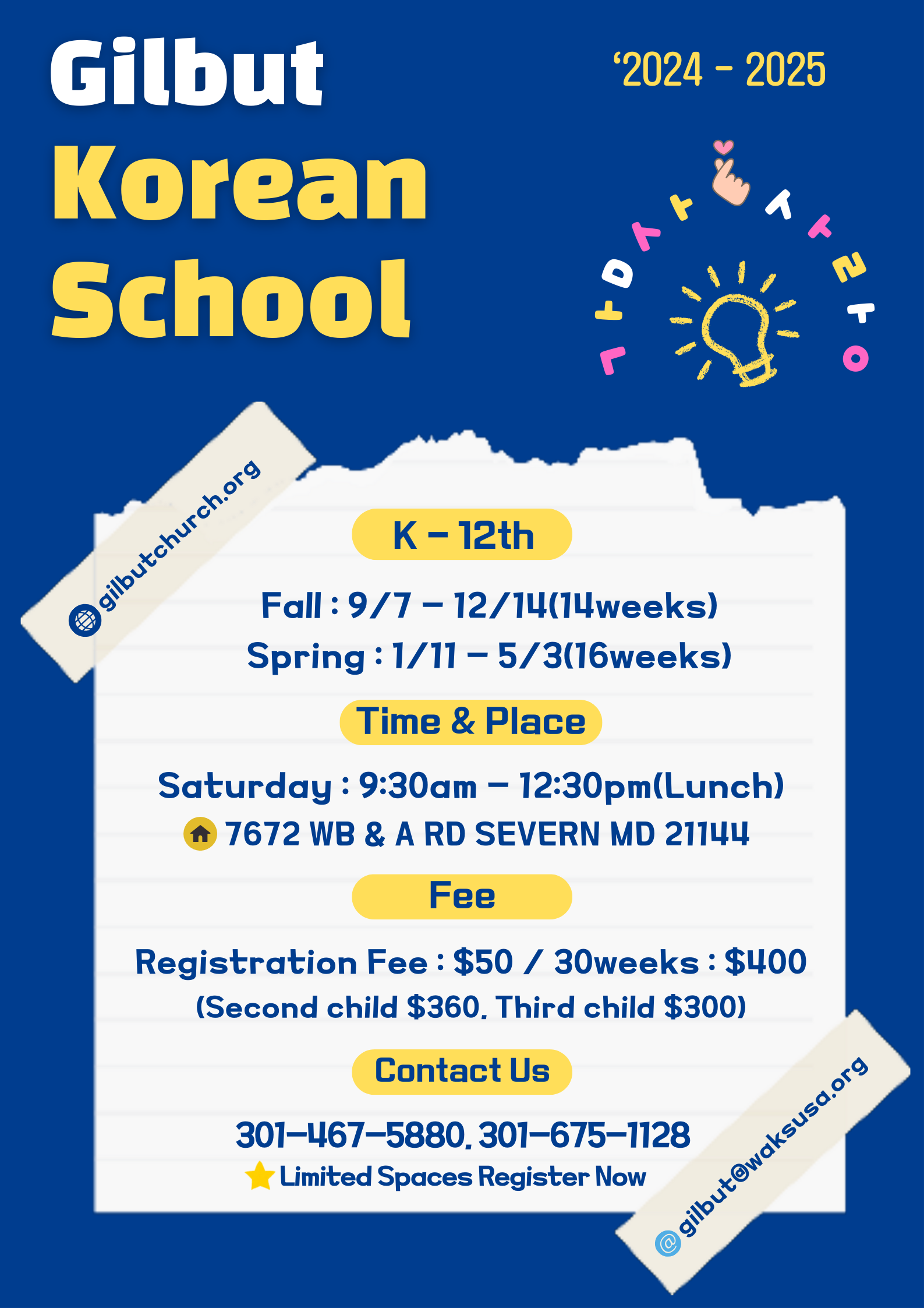 한국학교 2024-2025 한국학교 포스터 Publish on August 21,2024 | 길벗교회 페이지 정보 작성자 길벗교회 댓글 0건 조회 1,139회 작성일 24-08-21 04:19 목록 본문 2024-2025 한국학교 포스터 이전글2024-2025 한국학교 등록 Registration 24.08.21 다음글2024 Summer School Registration Form(등록) 24.04.02 댓글 0 댓글목록 등록된 댓글이 없습니다. 목록